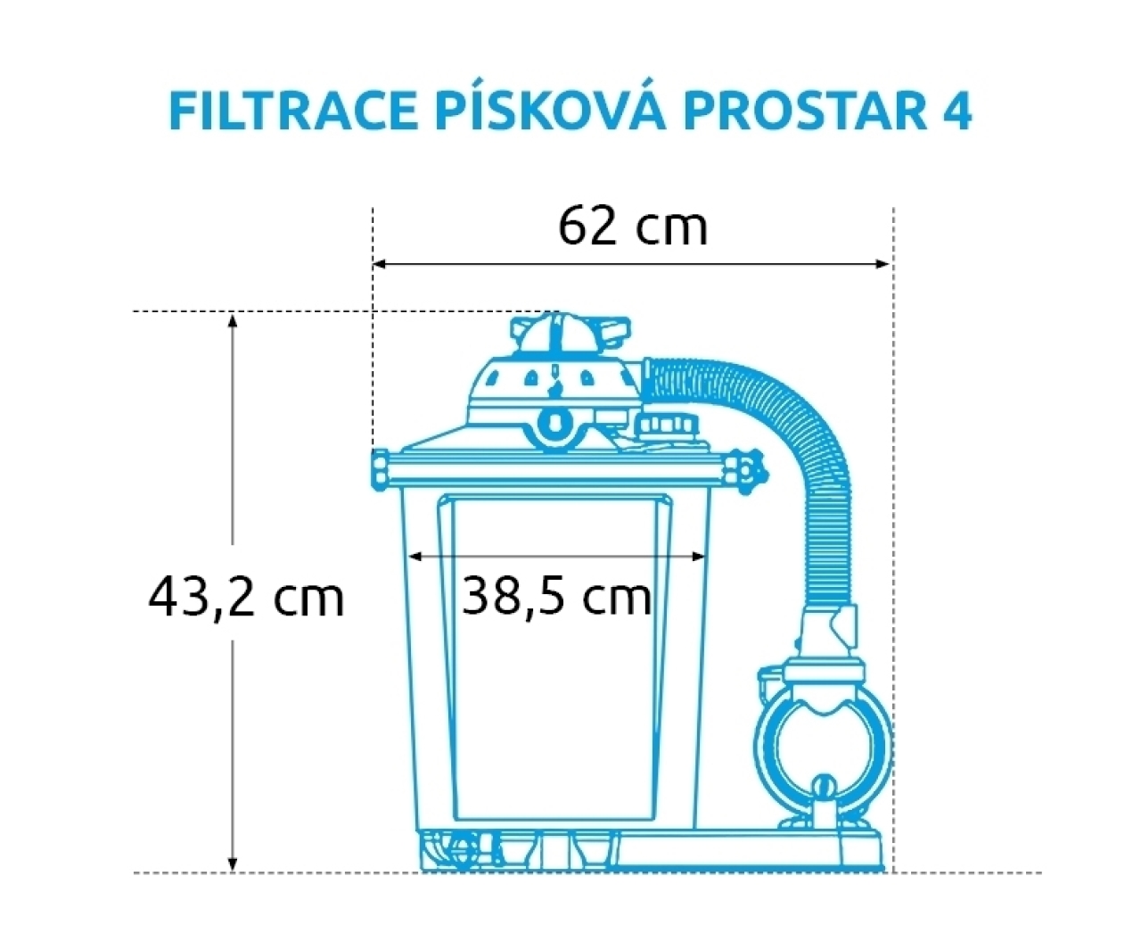 Filtračný systém pieskovej filtrácie ProStar 4 sa skladá z filtračnej nádoby, do ktorej sa zmestí 16 - 17 kg filtračného piesku. Nádoba je vyrobená z vysoko kvalitného polypropylénu (PP). Je bez švov, odoláva korózii a bežne dostupným chemikáliám používaných v bazénoch.