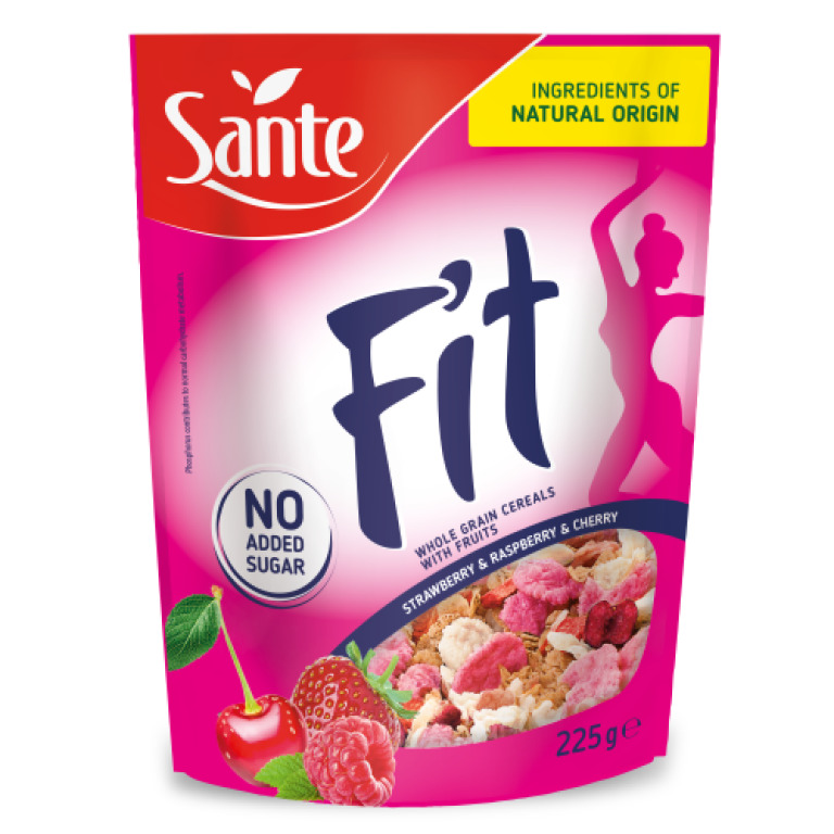 Fit Raňajkové cereálie - Sante Zloženie Príchuť jahoda, malina a čerešňa: Celozrnné vločky 76,6% (pšenica, ryža), sušené ovocie 18,6% v rôznom pomere [hrozienka (hrozienka, bavlníkový olej alebo / a slnečnicový olej alebo repkový olej), sušené ďatle (datle, ryžová múka) ], koncentrované ovocné šťavy ...viac