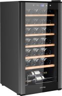 Vínotéka – energetická trieda F, samostatne stojaca s termočlánkom, na 12 fliaš uskladnených v 1 zóne, nastavenie teploty 10 – 18 °C, 3 police s dreveným dekorom a spodný úložný priestor, hĺbka políc 33cm, objem 32l, modrý LED displej, LED osvetlenie, trieda hlučnosti A, detský zámok, čierna farba, rozmery ...