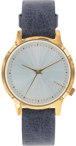 Dámske hodinky – analógové, strojček: Quartz batériový, priemer ciferníka 36mm, sklo: minerálne, vodotesné 30m (3ATM).Elegantné dámske hodinky KOMONO Estelle Corn Flower sú ideálnym doplnkom pre ženu, ktorá ocení spojenie prírodných materiálov s lesklými prvkami, ktoré spoločne vytvoria decentný, ale napriek tomu originálny šperk dotvárajúci každodenný outfit. Minimalistický ciferník so svetlo sivým podkladom je uložený v zlatom puzdre a vybavený minerálnym sklíčkom, ktoré odoláva nežiaducemu poškriabaniu. Ciferník okrúhleho tvaru poskytuje prehľadné zobrazenie aktuálneho času pomocou hodinovej, minútovej a sekundovej ručičky. Oproti iným hodinkám belgickej značky KOMONO je ciferník Estelle Corn Flower tenší a je vhodný aj na útlejšie zápästia. Všimnite si aj decentné umiestnenie značky vnútri ciferníka. Tieto analógové hodinky určené pre ženy dokonale dopĺňa jemne vzorovaný remienok z pravej kože sivo-modrej farby, ktorý vytvára na dámskej ruke veľmi pekný.