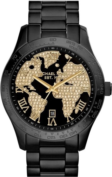 Módne hodinky Michael Kors z kolekcie Layton. Ideálny doplnok pre mužov i ženy uprednostňujúci analógové a guľaté hodinky. K ich skrášleniu naviac výrobca zvolil zirkonia. Vo vnútri odolného, 12 mm vysokého púzdra, ktoré tvorí kvalitný oceľ, nájdete spoľahlivý batériový (quartz) strojček poháňajúci v priemere 43 mm široký ciferník. Ten spoľahlivo chráni odolné minerálne sklíčko. Ako sami vidíte, púzdro zahalila čierna, ciferník čierno-zlatá a remienok čierna farba. Hlavným materiálom je oceľ a jeho dĺžku, v tomto prípade si môžete ľahko upraviť na obvod svojho zápästia. Tieto hodinky disponujú stupňom vodotesnosti 10 ATM.