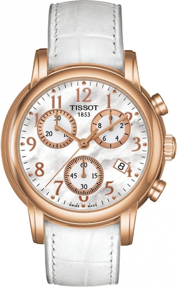 Označenie hodiniek:Dámske hodinky TISSOT T050.217.36.112.00 DRESSPORTOpis hodiniek:Športovo-elegantné dámske hodinky TISSOT DRESSPORT prepracované športovými detailmi s harmonickým mixom štýlu a presnosti sú ideálnou kombináciou pre uspokojenie každej modernej ženy.Strojček:ETA, Kaliber G15.211 - chronographPohon:Quartz, batériaMateriál púzdra:Nerez oceľMateriál remienka:Koža - biela farba, Motýlikové zapínanie s bezpečnostnou poistkouPovrchová úprava:Zlatené PVD - úprava (Ružové zlato)/Matná oceľSklo:ZafírovéCiferník:Perleť, Zlatené ručičky, Indexy/Arabské číslice (Ružové zlato)Vodeodolnosť:30 mRozmery hodiniek :Priemer púzdra: 35,00mm, Hrúbka púzdra: 10,00mm, Hmotnosť: 52,00gZáruka:2 rokyBalenie:TISSOT krabičkaŠpeciálne funkcie: - Chronograf - ručičkové stopky 1/10sec. max. do 30min., - Funkcia ADD (priebežné časy)- Funkcia SPLIT (medzičasy)- Dátumovka Funkcia ADDADD funkcia umožňuje odmerať po sebe nasledujúce časové úseky, pričom nie je potrebné počítadlá medzi dvomi udalosťami vynulovať. Každý nasledujúci čas sa pripočíta k predchádzajúcemu.Funkcia SPLIT-TIMESPLIT-TIME funkcia umožňuje zastaviť ručičky na prečítanie medzičasu, bez prerušenia počítania. Pri opätovnom spustení počítadlá "dobehne" čas a ručičky ukážu celkový uplynulý čas.
