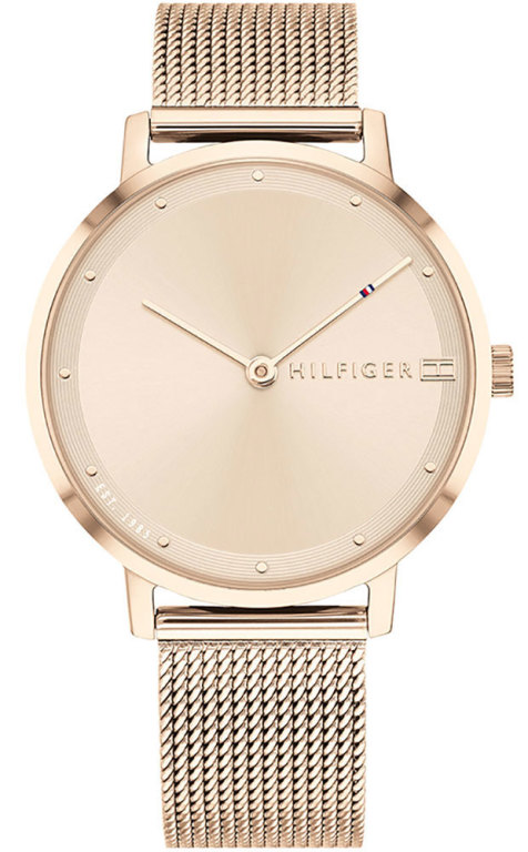 Módne hodinky Tommy Hilfiger z kolekcie Pippa. Ideálny doplnok pre ženy uprednostňujúci analógové a guľaté hodinky. K ich skrášleniu naviac výrobca zvolil. Vo vnútri odolného, 6 mm vysokého púzdra, ktoré tvorí kvalitný oceľ nájdete spoľahlivý batériový (quartz) strojček poháňajúci v priemere 35 mm široký ciferník. Ten spoľahlivo chráni odolné minerálne sklíčko. Ako sami vidíte, púzdro zahalila ružové zlato, ciferník ružové zlato a remienok ružové zlato farba. Z hľadiska materiálu vedie oceľ s pvd povlakom a jeho dĺžku, v tomto prípade 200 mm si môžete ľahko upraviť na obvod svojho zápästia. Tieto hodinky disponujú stupňom vodotesnosti 3 ATM.