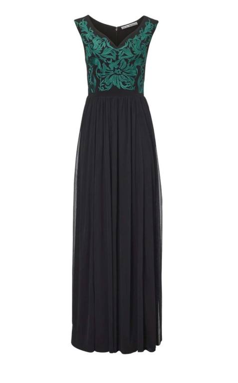Pre úplne veľkolepý výstup. Fascinujúce návrhárska kreácie s pravým diva šarmom. Príťažlivý empírový strih s náročnou kontrastne sfarbenou výšivkou. Horný diel je priliehavé s lichotivým výstrihom. Vzadu je zips vo šve. Záševky v páse. Priliehavý elegantný dole rozšírený diel sukňa z mierne priehľadného šifónu. Dĺžka ca. 136 cm, merané pri veľkosti 21 (tj. 42 skrátená). Jemne splývavý materiál 100% polyester. Podšívka 95% polyester, 5% elastan.Skrátená veľkosť sa hodí na výšku postavy do 165 cm.