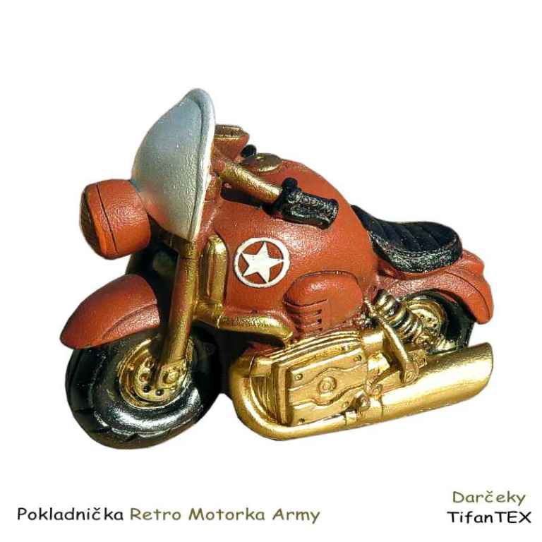 rozmery : 13 x 10 x 6,5 cm materiál : umelá živica pokladnička Retro Motorka Army špecifikácia : dekoračná motorka slúži aj ako pokladnička, ktorý urobí radosť nielen motorkárom, ale aj malým chlapcom v časti benzínovej nádrže sa nachádza otvor na vkladanie mincí na spodnej časti motorky je väčší otvor ...viac