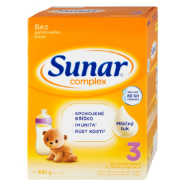 Batoľacie mlieko Sunar Standard 3 je vhodné pri prechode z materského mlieka a vďaka mliečnemu tuku má lahodnú chuť. Je prispôsobené špeciálnym potrebám batoliat, neobsahuje palmový olej a je cenovo dostupné.Unikátna receptúra batoľacieho mlieka Sunar Complex 3 je podľa vzoru materského mlieka prispôsobená špeciálnym potrebám batoliat,preto obsahuje viac dôležitých živín ako kravské mlieko.- s mliečnym tukom- bez palmového oleja Odporúčané dávkovanie Vek dojčatá Počet mliečnych dávok denne (24 h.) Odporúčaná celková potreba mlieka na deň (v ml) od 12–24 mesiacov 2 330 Príprava jednej porcie Voda (ml) Počet zarovnaných odmeriek Množstvo obnoveného mlieka (v ml) 150 5 165 Príprava: 1) Dôkladne si umyte a osušte ruky. Pripravte si čistý hrnček alebo náustok.2) Prevarte pitnú vodu vhodnú pre deti a nechajte ju vychladnúť napr. vo vodnom kúpeli na 40° C. Vlejte požadované množstvo do vysterilizovaného hrnčeka alebo pítka (pozri dávkovaciu tabuľku). Nespotrebovanú prevarenú vodu už pre ďalšiu prípravu mlieka nepoužívajte.3) Naplňte odmerku vrchovato práškom, prebytok zarovnajte ostrím noža a vsypte do hrnčeka požadovaný počet odmeriek (pozri dávkovaciu tabuľku). Dobre zatvorte a dôkladne pretrepte, až sa prášok rozpustí. Používajte vždy len priloženú odmerku.4) Pred podávaním dieťaťu si skontrolujte na vnútornej strane zápästia, že teplota mlieka nie je vyššia ako 37-40° C. Pripravenú porciu ihneď podávajte. Zloženie Odtučnené mlieko, laktóza (z mlieka), maltodextrín, smotana (obsahuje mliečny tuk), slnečnicový olej, kokosový olej, repkový olej, koncentrát srvátkovej bielkoviny (z mlieka), vápenaté soli kyseliny fosforečnej, citran draselný, uhličitan vápenatý, emulgátor (sójový lecitín ), chlorid horečnatý, chlorid sodný, L-askorbát sodný, rybí olej, cholín chlorid, síran železnatý, L-askorbyl-6-palmitát, inositol, síran zinočnatý, L-karnitín, D-α-tokoferol, nikotínamid, D-pantothenát vápenatý, síran meďnatý, retinyl palmitát, tiamín hydrochlorid, riboflavín, pyridoxín-hydrochlorid, jodid draselný, seleničitan sodný, kyselina listová, fytomenadión, cholekalciferol, D-biotín, síran mangánatý, kyanokobalamín. Upozornenie: Sunar Complex 3 je mliečna výživa v prášku. Je určený pre výživu malých detí od ukončeného 12. mesiaca veku dieťaťa v období odstavovaní alebo ak nemôžu byť dojčené. Má byť iba súčasťou zmiešanej a vyváženej stravy. Dojčenie je pre novorodencov a dojčatá najlepší spôsob výživy. Sunar Complex 3 nie je určený ako náhrada materského mlieka počas prvých šiestich mesiacov života. Nie je určený deťom do 1 roka. Skladovanie: Skladujte na suchom a tmavom mieste pri teplote do 24 ° C v dostatočnej vzdialenosti od tepelných zdrojov. Neskladujte v chladničke. Vždy podávajte iba čerstvo namiešanú porciu. Pripravenú porciu spotrebujte do 2 hodín. Nespotrebovanú porciu ďalej neuchovávajte a znova nepodávajte. Po príprave každej dávky balenie vždy starostlivo uzavrite a uložte na suchom a tmavom mieste. Obsah otvoreného balenia spotrebujte do 4 týždňov.Zarovnaná odmerka obsahuje 4,4 g Sunar Complex 3 a zodpovedá 87,7 kJ (20,5 kcal). 100 ml Sunar Complex 3 = 3 zarovnané odmerky (13,3 g prášku) + 90 ml vody. .
