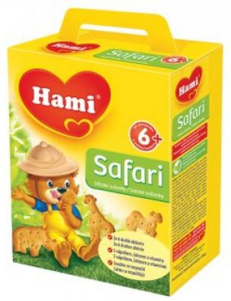 Vlastnosti.Od ukončeného 6. mesiaca, Receptúra zodpovedá požiadavkám Českej pediatrickej spoločnosti, 100% bez konzervačných látok podľa zákona.Marketing produktu.Obilné chrumkavé sušienky Hami Safari s vápnikom, železom a vybranými vitamínmi skupiny B. Pre svoju lahodnú chuť sú Hami Safari sušienky ideálne ako doplnok desiatej. Tvarom a veľkosťou sú špeciálne prispôsobené do malých detských ručičiek a sú vhodné na prerezávanie prvých zúbkov.100% bez konzervačných látok* s vápnikom, železom a vitamínmi skupiny B ideálne pre prerezávanie prvých zúbkov* podľa zákona.Ďalší popis.Viete, že?Jedlo vhodné do ruky, ako sú napr. detské sušienky alebo kúsky zeleniny a ovocia, pomáha dieťaťu rozvíjať schopnosť držania predmetov v ruke a koordináciu pohybov.S otázkami ohľadne Vášho bábätka Vám radi pomôžeme na našej infolinke alebo na stránkach www.klubmamiciek.sk.Potravina na osobitné výživové účely na báze obilia určená pre dojčatá a malé deti od ukončeného 6. mesiaca.Zloženie.Zloženie v 100 g výrobku:, Pšeničná múka 75%, Cukor, Palmový olej, Sušené odtučnené mlieko, Kypriace látky (hydrogénuhličitan amónny, hydrogénuhličitan sodný, hydrogénvínan draselný), Uhličitan vápenatý, Extrakt jačmenného sladu, Arómy, Emulgátor (sójový lecitín), Zmes vitamínov (B1, B2, niacín, B6), Mliečnan železnatý.Môže obsahovať stopy vajec.