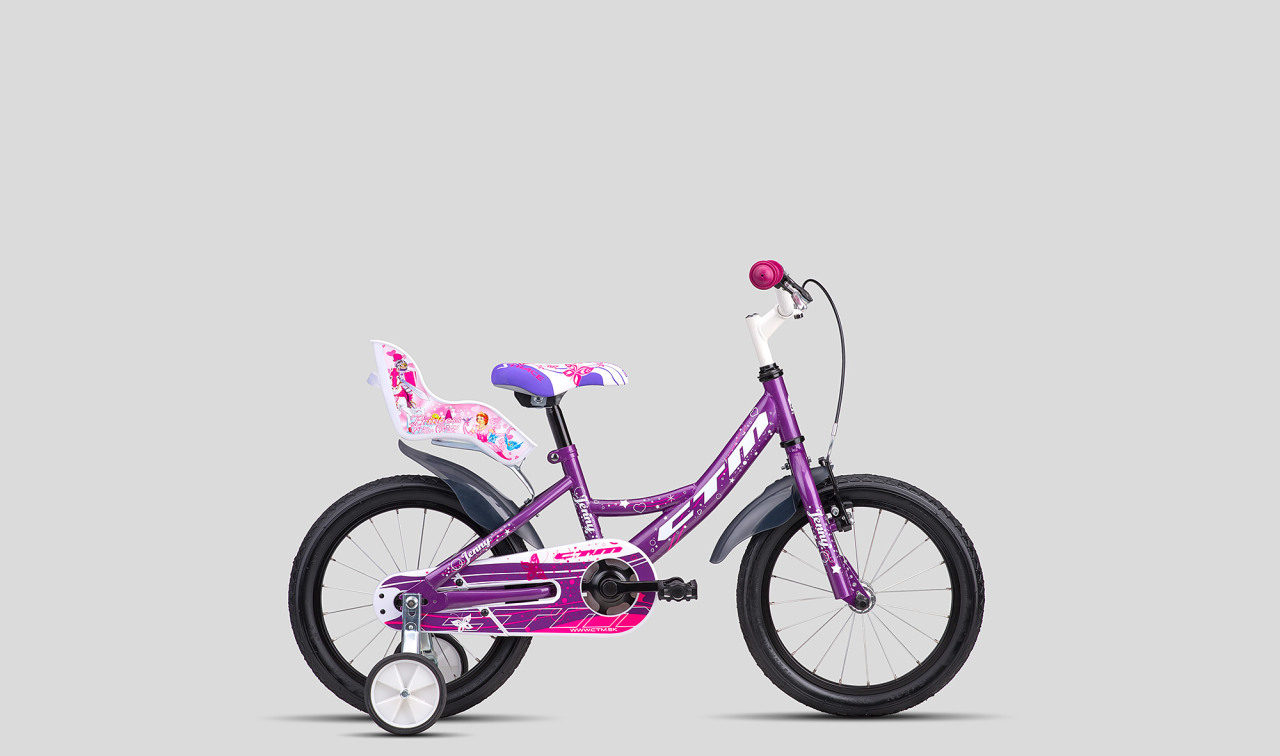 CTM Jenny krásny jednoduchý bicyklík pre maličké dámy, ktoré sa chcú voziť aj so svojou neodmysliteľnou bábikou, či inou hračkou. 9" odolný oceľový rám so zjednodušeným vysadaním a zosadaním, 16" kolesá, torpédová zadná brzda, plastový chránič detských nôžok pred reťazou, plastové blatníky, hravé dievčenské farby a s rovnováhou pomôžu podporné kolieska. Jenny, dokonalá už od prvých metrov na bicykli. Vhodný pre deti vo veku 4 - 6 rokov alebo na výšku postavy 100 - 125 cm.