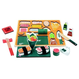 Táto kreatívna farebná hračka sa bude páčiť všetkým deťom. Môžu si zahrať na Japonca a zložiť si vlastné sushi. Balenie obsahuje 27 dielikov, pevnú servírovaciu dosku z preglejky a drevený nôž na "rezanie". Deti si precvičia jemnú motoriku, logické myslenie a sústredenie ruka-oko. Stimuluje sa predstavivosť a rozvíjajú sa zručnosti potrebné na riešenie rôznych situácií.