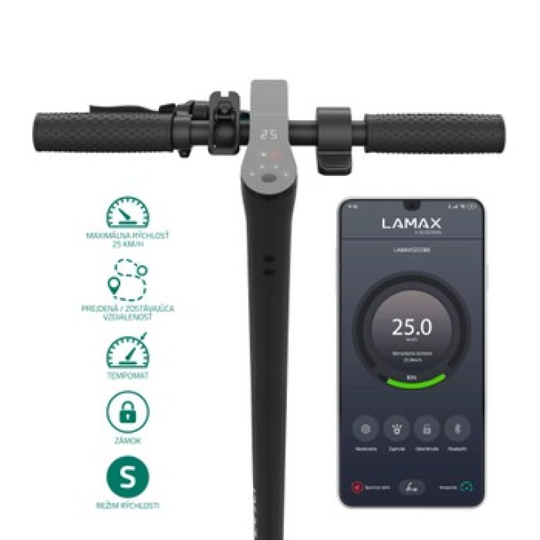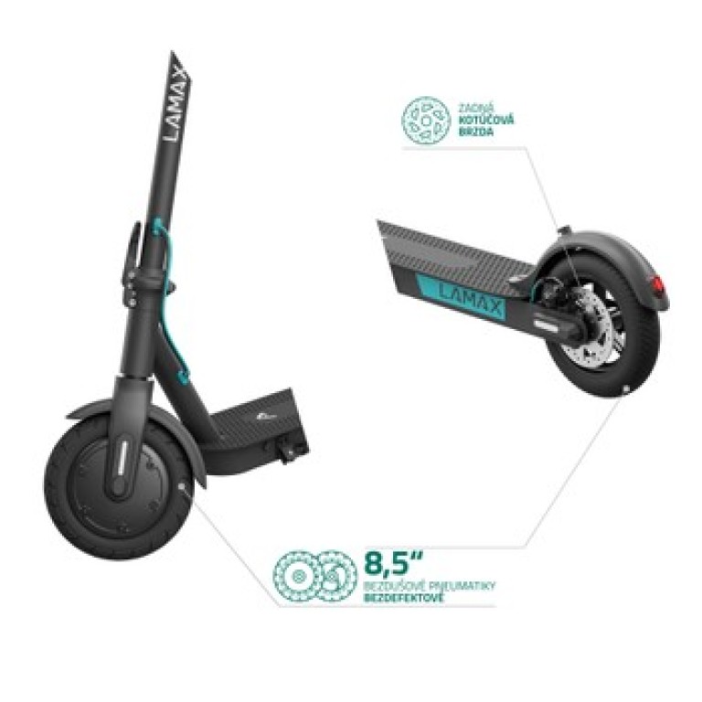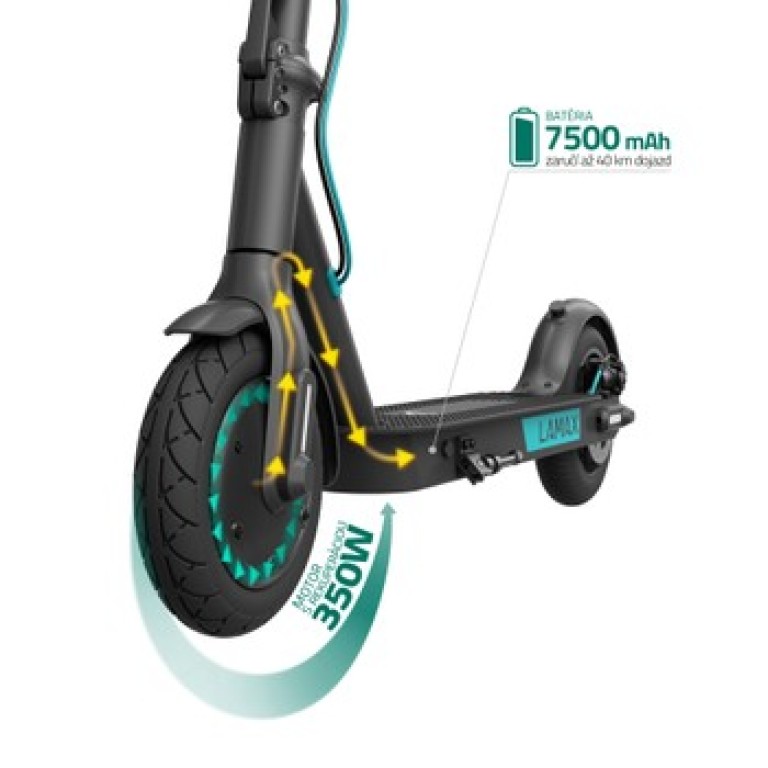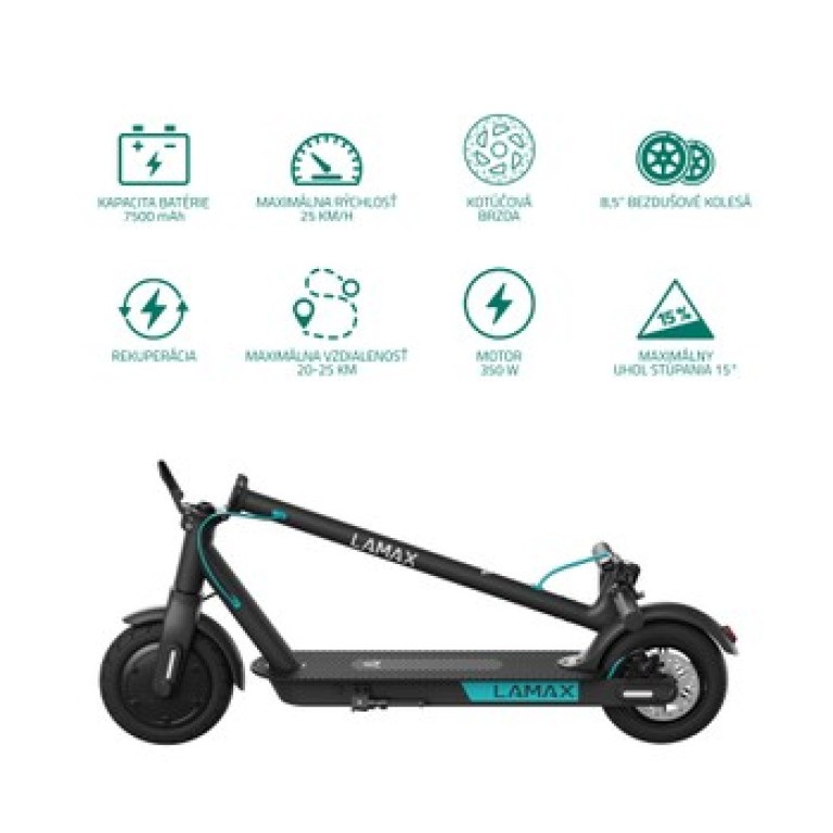 Elektrická kolobežka s výkonom 350 W, nosnosť 100kg, čierna a tyrkysová farba, maximálna rýchlosť 25 km/h, dojazd až 25 km, kapacita batérie 7.5 Ah, skladacia konštrukcia, hmotnosť 13kg Elektrická kolobežka Lamax E-Scooter S7500 Plus s dojazdom až 25 kmKam je to pešo ďaleko, tam budete s elektrickou kolobežkou E-Scooter S7500 Plus za pár minút. Užite si mesto z inej perspektívy. Bez kolón, bez plnej MHD, zato v rýchlosti až 25 km/h. Cestujete aj na väčšie vzdialenosti? Elektrokolobežku v sekunde zložíte a naskočíte s ňou do busu. 8,5” bezdušové pneumatiky navyše nikdy nepichnete a pritom ľahko zvládnu každú nerovnosť. Silná kotúčová brzda a LED svetlá sa v uliciach postarajú o bezpečnú jazdu pre všetkých účastníkov.Rýchla cesta do školy aj do práceOdpichnite sa a môžete svišťať rýchlosťou až 25 km/h. Na výber máte dva jazdné režimy – eko a športový. 350 W motor vás bez problémov vytiahne aj do kopca a vďaka ekologickej rekuperácii pri každom zabrzdení sa.