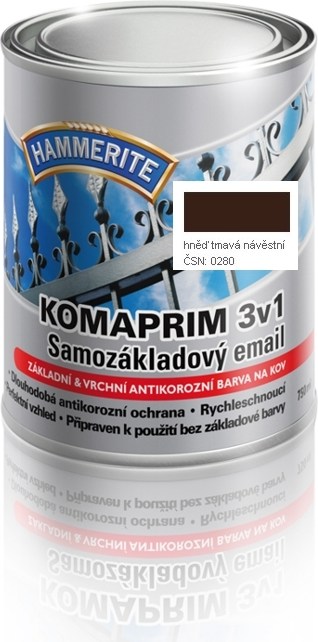 HAMMERITE Komaprim 3v1 Samozákladový email, antikorózna farba na kov HAMMERITE Komaprim 3v1 Samozákladový email je základná a vrchná antikorózna farba na kov. Vyznačuje sa dlhodobým antikoróznym účinkom, vysokou odolnosťou voči poveternostným vplyvom, pripravený je na použitie bez základnej farby, rýchloschnúci. Komaprim 3v1 je multifunkčný náter na oceľ, zoxidovanú pozinkovanú oceľ alebo železo, na konštrukcie, dvere, strechy, stĺpy pre vonkajšie a vnútorné použitie. Výdatnosť: 10-12m2/liter v jednej vrstve. Počet vrstiev: 2-3. Riedidlo: Neriedi sa. Schnutie: na dotyk po 3h, pretierateľný po 6 hodinách. Aplikácia: štetcom, valčekom, striekaním.