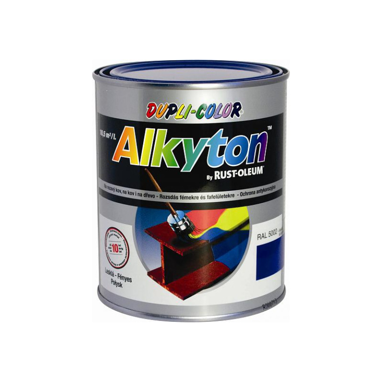 ALKYTON je náterová hmota na báze alkydových živíc modifikovaných uretánmi.Náter vykazuje vynikajúcu pružnosť, odolnosť voči úderu a dobrú charakteristiku zasychania i pri nižších teplotách /od + 5°C /.Účinné antikorózne pigmenty vytvárajú dlhodobú antikoróznu ochranu.Výrobok má veľmi dobrú priľnavosť aj na skorodovaný povrch po ručnom očistení.Použité rozpúšťadlá dodávajú výrobku vynikajúcu zlievateľnosť - pri aplikácii štetcom možno dosiahnuť vzhľad podobnej kvality ako pri striekaní.Modifikácia alkydových živíc uretánmi dodáva výrobku dlhodobú farebnú stálosť a podstatne predlžuje lesk.Podrobný popis.Možno aplikovať priamo na hrdzu.Alkyton je antikorózna farba na hrdzu, kov, drevo a betón.Vlastnosti Alkytonu:.samozákladový email.trvalo pružný.kryje v jednej vrstve.farebná stálosť.odpudzuje vodu z povrchu (obsahuje silikón).zaschne už od +5 °C.Použitie.strechy, odkvapy, ploty, brány, mosty, haly.pre nové a skorodované železné kovy v exteriéroch a koróziu.drevo v exteriéry.na betón.na ľahké kovy ako zinok, hlinik, nerez, sklo a plasty, ošetrené základom Galvinol.poskytuje dlhodobu ochranu proti počasiu a UV žiareniu.Alkyton nie je určený na trvalý ponor.Príprava podkladu.Podklad musí byť počas aplikácie čistý a suchý. Z podkladu odstraňte mastnotu, nečistoty, hrdzu a uvoľnené nátery alkalickým alebo tlakovým čistením. Škrabkou a oceľovou kefou odstráňte okuje, voľné korózne spolodiny a zvyšky starých farieb. Staré nátery je potrebné prebrúsiť, aby sa jemne zdrsnil povrch.Riedenie.Štetec a valček: riedenie max. 10% obj. tuzemského riedidla S 6005.Vzduchové striekanie: riedenie 10 - 30% obj. riedidlo S 6001 veľkosť trysky: 1-1,5mm, tlak 2-4 bary Kontrolujte hrúbky mokrého filmu.Bezvzduchové striekanie:  riedenie až 20% obj. riedidlo S 6001 veľkosť trysky: 0,009-0,013 inch, kvapaliny:150-200 barov Kontrolujte hrúbky mokrého filmu a nevyhnite sa nanášaniu nadlimitných hrúbok filmu.Aplikácia.Pred aplikáciou farbu dôsledne premiešajte. Odporúča sa farbu neriediť, ak sa aplikuje pri nízkych teplotách. Prílišné riedenie znižuje podiel sušiny, čo spôsobuje zníženie hrubky náterového filmu. Riedenie má vplyv na čas zaschýňania. Optimálne podmienky pre aplikáciu sú teplota 20oC a relatívna vlhkosť pod 70%. Odporučaná hrubka náteru: 50?m suchý film = 120?m mokrý film v jednej vrstve. Ak je náter nanášaný ako samozákladový v exteriéroch, odporúča sa pre antikoróznu ochranu nanášanie dvoch vrstiev.Štetec: pre nanášanie Alkytona používajte ploché prírodné štetce s dlhým vlasom. Ako prvé odporúčame natierať hrany, ťažko prístupné miesta, matice a hlavice skrutiek. Finálny náter nanášajte po zaschnutí.Valček: pre nanášanie Alkytona používajte polyamidové (perlonové) 8mm alebo mohérové 4-6 mm valčeky. Farbu nanášajte rovnomerne v jednom smere bez opakovaného ťahu valčeka na jednom mieste. Pre dosiahnutie doporučanej hrubky suchého filmu 55µm  nanášajte farbu v dvoch vrstvách.Čistenie nástrojov: S 6005, C 6000.Výdatnosť: 10,5 m2/l.Doba schnutia.Na prach: 2 hod.Na dotyk: 4 hod.Pre manipuláciu: 8 hod.Pretierateľný: 16 hod.Tvrdý: 7 dní.