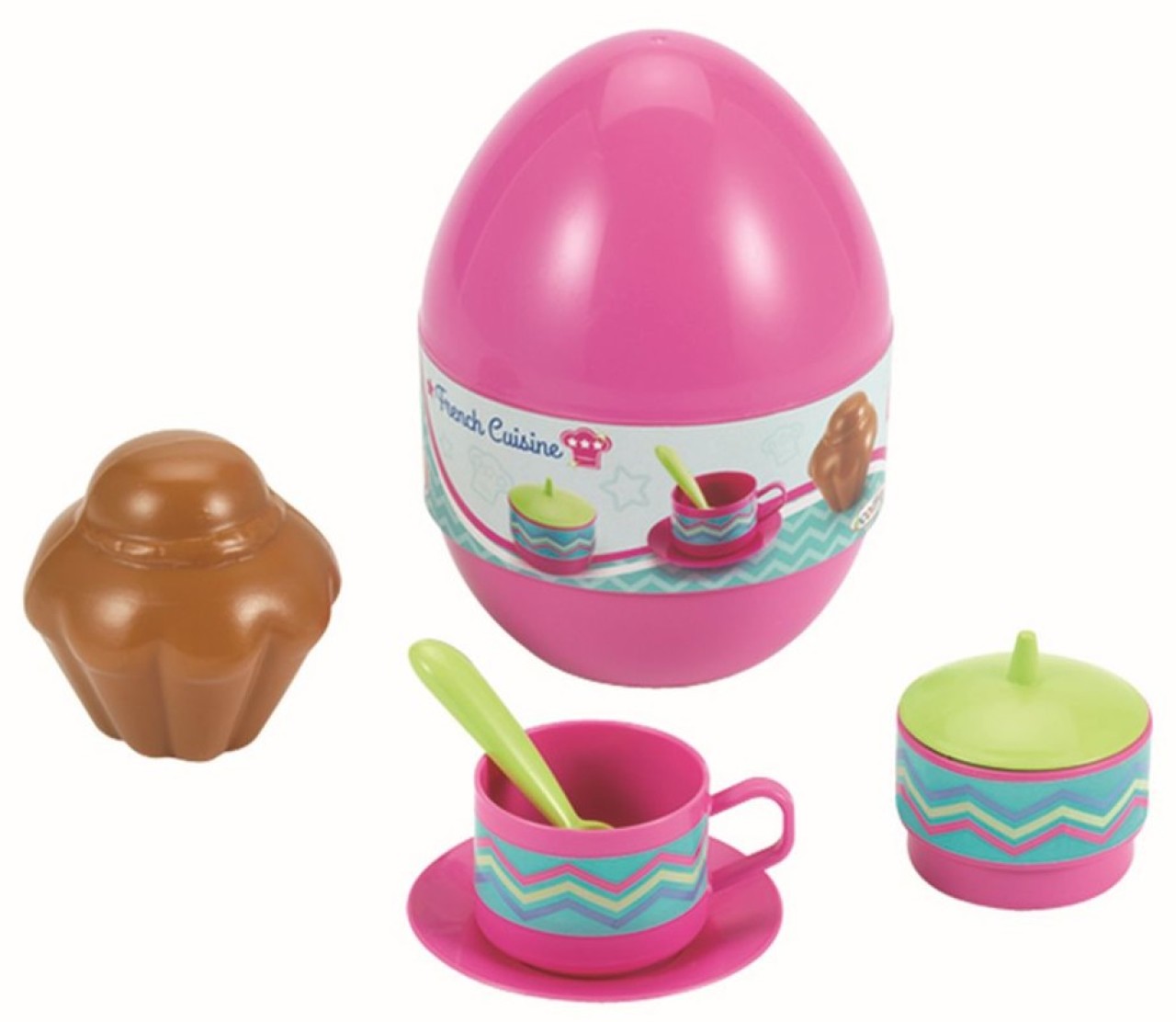 Vajíčko s prekvapením French Cuisine je jedinečná hračka pre najmenšie deti od 18 mesiacov. Vo vajíčku pre deti sa nachádza čajová súprava, ktorú tvorí šálka s podšálkou, koláčik a cukornička s pokrievkou. Celá čajová sada pre deti má krásnu ružovú farbu, ktorú si zamiluje každá slečna. Vajíčko s čajovou sadou sa hodí do detskej kuchynky, ale aj na samostatnú hru.Écoiffier je francúzsky výrobca, ktorý vyrába kvalitné detské hračky. Écoiffier spĺňa najvyššie európske kritériá, preto sú hračky Écoiffier vhodné aj pre najmenšie deti. Vo svete, kde sa najčastejšie stretávame s výrobkami vyrobenými v Číne, sa výrazne odlišuje francúzsky Écoiffier s originálnym dizajnom ovplyvneným najnovšími trendmi, bezpečnostnými kritériami v priebehu výroby a kvalitou za primeranú cenu.