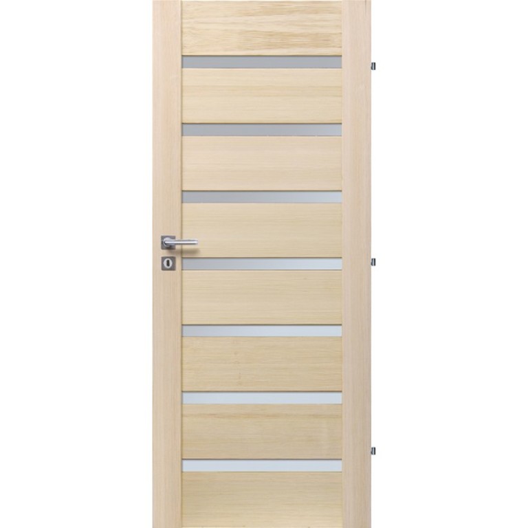 KONSTRUKCE Kazetové masivní dveře z borovice: Sukové provedení: dveře jsou vyrobeny z borovicového dřeva se suky. Dýhované provedení: plocha dveří je navíc dýhovaná přírodní borovici bez suků, která má tloušťku 1,5 mm. Šíriky rám až 12 cm zaručí větší pevnost dveří a delší životnost. Pevný kolíkový spoj a na perodrážku - zvýšená pevnost dveří. Falcové polodrážkové provedení. Profilované kazety o tloušťce 18 mm mají frézování po obvodu, což tvoří klasický styl dveří. Estetické zasklení bez použití rámečků přidává dveřím luxusní vzhled. Povrchová úprava: přírodní dřevo. U vybraných modelů: olej, OLD TOWN olej, kartáčovaný OLD TOWN olej. Dveře jsou vhodné pro další nátěr. Sukové provedení může obsahovat drobné vady dřeva v podobě škrábanců nebo vytlačení na povrchu, proto před lakováním doporučujeme dveře přebrousit jemným brusným papírem. Dýhované provedení bez laku před nátěrem je třeba přebrousit jemným brusným papírem. KOVÁNÍ Tří stříbrné panty šroubovací s horizontální regulací. Klasický zámek na dozický klíč, na cylindrickou vložku, WC zámek, úsporný zámek (jen klika). PROSKLENÍ 4 mm tvrzené matné sklo v ceně dveří. Změna skla na KŮRA ČIRÁ 400,- Kč bez DPH.