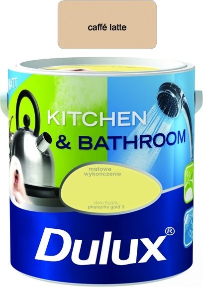 Dulux KITCHEN & BATHROOM je maliarska umývateľná natónovaná farba vysokej kvality na steny a stropy určená najmä do kuchýň a kúpeľní. Použitie: Akrylátová emulzná umývateľná farba Dulux Kitchen & Bathroom s matným alebo saténovým povrchom na steny a stropy, určená pre interiérové dekoračné a ochranné nátery stien a stropov najmä do kuchýň a kúpelní. Je možné ju použiť na omietky (cementové, vápennocementové), sadrové podklady, sadrokartónové dosky, papierové tapety a tapety zo skleného vlákna. Tixotropná štruktúra spôsobuje, že pri natieraní farba neodkvapkáva, čo je veľmi praktické vtedy, ak nie je možné premiestiť alebo dostatočne zaistiť napr. nábytok. Farba je dostupná v bielej a ďalších inšpirujúcich odtieňoch a týmto umožňuje jednoduché spestrenie interiérov. Vlastnosti: Farba je odolná proti mastnote, vlhkosti a plesniam. Odolná proti oteru suchou látkou, vysoko odolná proti opakovanému mytiu vodou s prísadou umývacieho prostriedku a mytiu jemnou hubou. Výrobok je výnimočný svojou extrémnou odolnosťou proti oteru. Farba je paropriepustná, čo umožňuje stenám dýchať. Je ľahko roztierateľná a i pri nízkej spotrebe umožňuje zachovanie dobrého krytia. Vysoká odolnosť proti rastu plesní. Schnutie: Farba je pretierateľná po 2 až 4 hodinách. Výdatnosť: 14 m2/1 l. Aplikácie: štetcom alebo valčekom. Čistenie: voda.