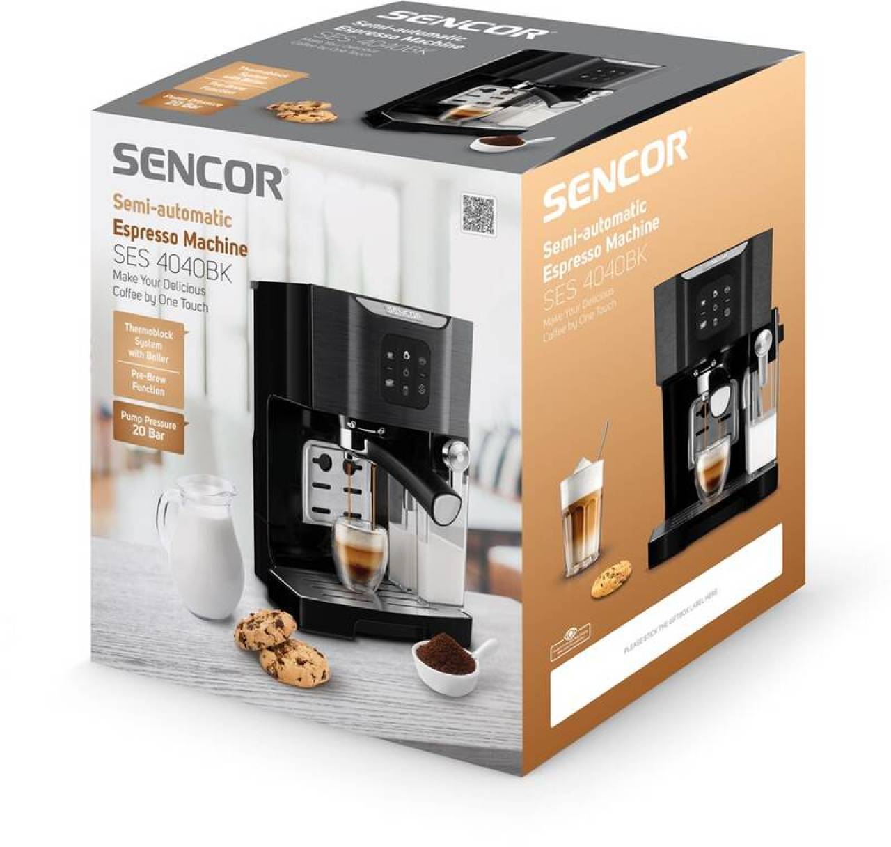 Sencor SES 4040BK pákový kávovar • pripravíte espresso, capuccino, latte, macchiato • príkon 1 450 W • tlak 20 barov • 1,4l nádržka na vodu • nádoba na mlieko • parná tryska s funkciou nasávania mlieka • ...viac