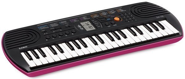Detský keyboard Casio SA-78.Detský keyboard so 44 mini klávesami, vhodnými pre malé detské prstíky. Nástroj disponuje 100 zvukmi, vrátane základných zvukov, ako sú Grand piano, gitara, saxofón, trúbka, husle atď. 50 rytmami, 10 demo skladbami s funkciou vypnutia melódie, polyfónia max. 8 hlasov, 5 bicích padov, LCD display, 2× 0,8W reproduktor, mini stereo jack vstup pre slúchadlá. Napájanie pomocou 6 AA batérií, alebo adaptéru, ktorý však nie je súčasťou balenia (odporúčaný adaptér AD-E95100). Rozmery klávesu 604 x 211 x 57 mm, hmotnosť 1,4 kg, čierno-fialové farebné prevedenie.Detské klávesy.44 mini klávesov.100 zvukových registrov.50 rytmov.10 demo skladieb s funkciou vypnutia melódie.Polyfónia max. 8 hlasov.5 bicích padov.LCD displej.Dva reproduktory: 2x 1,2 W.Napájanie: 6x batéria AA / adaptér AD-E95100 (nie je súčasťou).Rozmery: 604×211×57 mm.Hmotnosť: 1,5 kg.Farba: čierno-fialová.