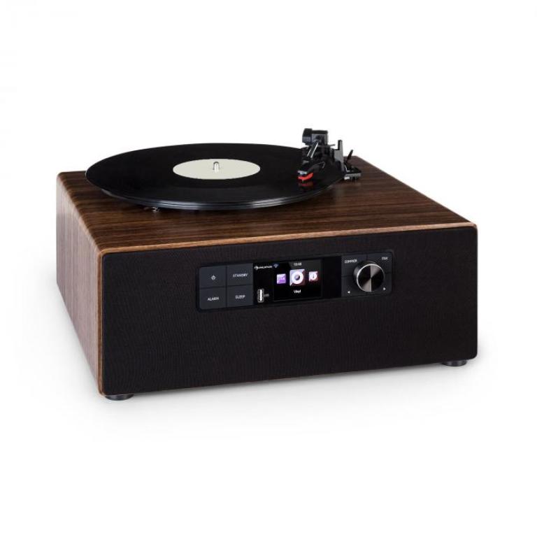 Gramofón auna Connect Vinyl Cube s inteligentným rádiom kombinuje klasiku s modernou technológiou a obohacuje Váš domov vďaka integrovaným reproduktorom s vysokou kvalitou zvuku.V zariadení auna Connect Vinyl Cube majú svoje miesto rádio stanice z celého sveta. Vďaka kompletnej ponuke internetového rádia, DAB+ a FM rádia máte na výber až z 10 000 staníc, ktoré uspokoja naozaj každého. Popri smart rádiu je akustickým srdcom systému nepochybne vrchný gramofón. Bez problémov prehráva vinyly s 33, 45 alebo 78 otáčkami, vďaka čomu zaznie zvuk gramofónových platní. Okrem toho má systém k dispozícii WiFi, USB port a vstup AUX, vďaka čomu je možné prehrávať nespočetné množstvo MP3 a audio súborov. Samozrejme je k dispozícii aj bezdrôtová funkcia bluetooth. Zariadenie Connect Vinyl Cube umožňuje spoľahlivé streamovanie zvuku cez smartfón, tablet alebo laptop. Ovládanie je tiež neskutočne jednoduché. Všetky funkcie sa dajú zapnúť priamo na zariadení, pomocou diaľkového ovládača alebo prostredníctvom aplikácie AirMusic zo smartfónu alebo tabletu. Aby ste presne vedeli, čo robíte, systém má prehľadný 2,4" TFT farebný displej s technológiou HCC Display. Pomáha pri ovládaní, ale tiež zobrazuje rádiové informačné texty, hudobné tituly, hodiny alebo časy budíka.Výkonné zariadenie v tvare kocky s mnohými možnosťami prehrávania a štýlovým vzhľadom: gramofón Connect Vinyl Cube od spoločnosti auna.