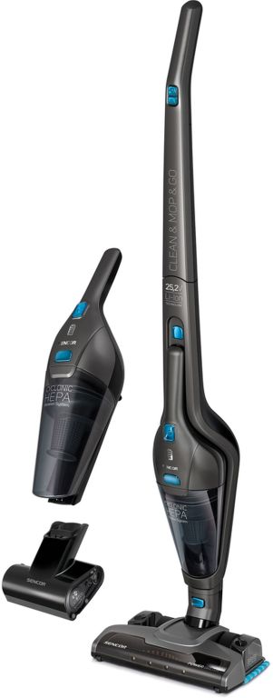Bezšnúrový tyčový vysávač 4 v 1 s mopom.. Bezšnúrový tyčový vysávač 4 v 1 s mopom a možnosťou vybratia ručné jednotky.. Úplná voľnosť pohybu bez napájacieho kábla.. Ľahký, tichý a ľahko ovládateľný vysávač ponúka rýchle a jednoduché riešenie pre každodenné upratovanie všetkých typov povrchov vrátane vytieranie tvrdých podláh.. Vysáva a vytiera tvrdé podlahy jedným ťahom.. Odnímateľná ručné jednotka pre pohodlné odstraňovanie prachu a nečistôt z nábytku, stola či upratovanie vozidla.. Motorový rotačná kefa "Cat & Dog Mini" pre ručné jednotku.. Vysoko účinná batéria Li-Ion 25,2 V s krátkou dobou nabíjania a dlhou dobou prevádzky:.. Doba nabíjania 4-6 hodín.. Doba prevádzky až 50 minút.. Systém cyklónovej filtrácie HEPA.. Rotačná kefa s vlastným motorom zaručuje vynikajúce výsledky na akomkoľvek type podláh a zlepšuje vysávanie nečistôt na kobercoch.. Hubica s LED osvetlením ľahko odhalí aj najjemnejší prach a zjednoduší vysávanie v temnejších miestach.. Funkcia samostatného státie pre dočasné odstavenie i pohodlné uloženie.. Nabíjacia základňa pre praktické uloženie vysávača je opatrená integrovaným držiakom príslušenstva.. Skvelá ovládateľnosť a ľahké manévrovanie okolo nábytku vďaka hubicu vysávača otočné v rozsahu 180 ° a nízkej hmotnosti vysávače.. Ergonomická rukoväť.. LED indikátor nabitia batérie.. 2 rýchlosti prevádzky: vysoký výkon, predĺžený čas vysávania.. Zahrnuté príslušenstvo: štrbinová hubica a prachový kefka.. Bezsáčková technológie, objem nádoby na prach: 0,5 l.. Jednoduchý systém rozloženie pre ľahké vyprázdnenie nádoby na prach i čistenie filtra.. Typ batérie: Li-Ion 2 600 mAh.. Napájacie napätie: 25,2 V.. Úroveň hlučnosti: 79 dB.. Rozmery: šírka: 273 mm, výška: 1 160 mm, hĺbka: 162 mm.