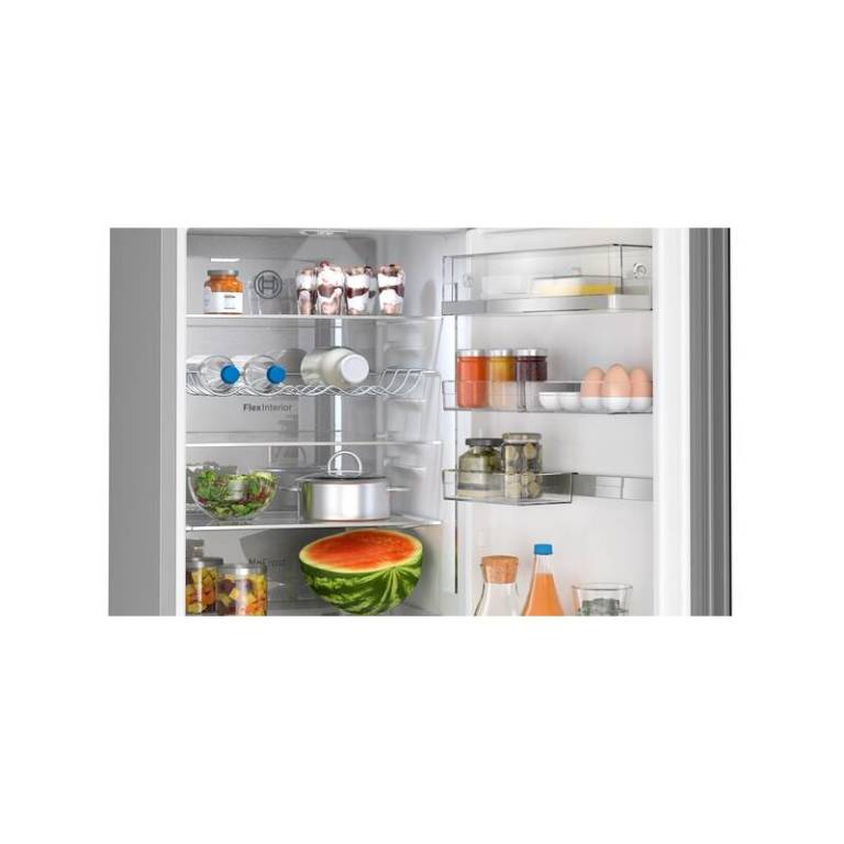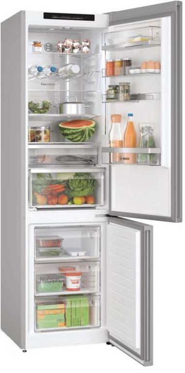 Chladnička s mrazničkou dole, energetická trieda C, klimatická trieda SN-T, objem chladničky 260l, objem mrazničky 103l, smer otvárania: doprava, počet políc chladničky 5, počet priehradiek mrazničky 3, počet chladiacich okruhov 2, čierna farba, funkcie: total No Frost, samorozmrazovacia mraznička, automatické odmrazovanie, s displejom, nulová zóna, LED osvetlenie, indikácia otvorených dverí chladničky, super chladenie, super mrazenie, twin Cooling, Multi-AirFlow, elektronické ovládanie teploty, 203×60×66.5cm (V׊×H) Chladnička a mraznička Bosch disponuje chladiacou aj mraziacou časťou a je najčastejším riešením pre väčšie aj menšie domácnosti. Je to klasický, voľne stojací model, ktorý nebude problém umiestniť do vašej kuchyne. Pri inštalácii nemusíte riešiť smer otvárania, pánty sú vsadené napravo, ale dvierka môžu byť obrátené. Chladnička BOSCH KGN39LBCF spadá do energetickej triedy C. Klimatickú triedu dokazuje skratka SN-T. Emisia hluku šíreného vzduchom.