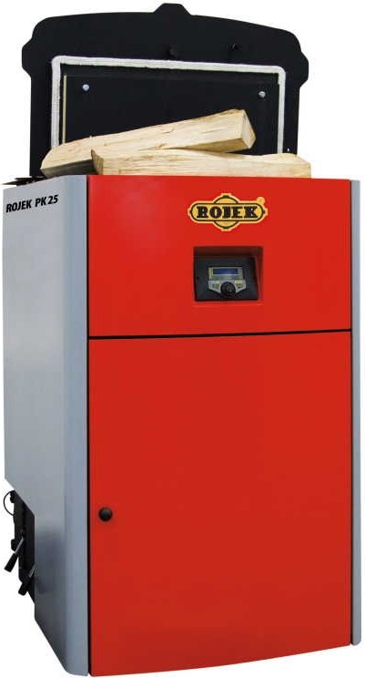 ROJEK Teplovodný kotol PK 25 pyrolýzny, na suché drevo.PK 25.Teplovodné pyrolytický kotol na tuhé palivá (s dochladzovacou slučkou).menovitý výkon kotla 25 kW.Pyrolytický kotol PK 25 na ručné prikladanie je určený k spaľovaniu palivového dreva - kusové drevo o dĺžke 530 mm, vlhkosť paliva do 20%, výhrevnosť 14 - 18 MJ.kg.Kotlové teleso je zvarené z akostnej ocele. Všetky plochy, ktoré sú v styku so spalinami sú z plechu hr. 5 mm. Ostatné plochy sú z plechu hr. 4 mm.Prednosti pyrolytických kotlov PK:.Plnenie spaľovacej komory kotla je veľmi jednoduché a rýchle.Väčší objem spaľovacej komory (130 l).Vysoká účinnosť 88,9%.Kotly spĺňajú triedu 3 podľa STN EN 303.Max. dĺžka polenové dreva 530 mm.Dlhšia doba vyhorenia spaľovacej komory až 7 hod pri menovitom výkone.Jednoduché čistenie výmenníka pomocou ovládacej páky a čistiacich dvierok prístupných z vonkajšej strany.Kotly sú riadené elektronickou ovládacou jednotkou, ktorá ovláda: odťahový ventilátor, teplotu vody v kotli.Regulátor je vybavený programom zPID.Regulátor okrem štandardných čidiel je vybavený taktiež spalinovým čidlom. Regulácia tohto typu spočíva v kontrolovanie teploty spalín a teploty kotlovej vody. Na základe týchto hodnôt regulácia mení otáčky ventilátora tak, aby bola udržiavaná zadaná teplota kotlovej vody.Používaním tohto typu regulátora sa spalinovým čidlom šetríme až 13% paliva, teplota výstupnej vody je veľmi stabilný, čo má vplyv na dlhšiu životnosť výmenníka (kotla). Kontrola teploty spalín na výstupe z kotla zapríčiňuje nízke emisie prachu a plynov škodlivých pre životné prostredie. Tepelná energia je plne využitá pre ohrev vody v kotle a neuniká do komína.PK 25 - Technické údaje.Menovitý výkon 25 kW.Účinnosť 88,9%.Priemer dymovodu 159 mm.Elektrický príkon 50 W.Napätie / kmitočet 230V / 50Hz.Objem násypky 130 l.Objem vykurovacej vody 98 l.Priemer vstupu a výstupu vody DN G 2 ".Výška dymovodu 695 mm.Rozmery (šírka x výška x hĺbka) 836 x 1 186 x 1 262 mm.Trieda kotla podľa EN 303-5 3.Doporučené palivo suché drevo 15 - 17 MJ / kg.Max. priemer / dĺžka polien 250/530 mm.Vlhkosť paliva 12 - 20%.Spotreba dreva pri menovitom výkone 6,4 kg / h.Predpísaný ťah komína 17 Pa.