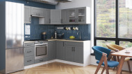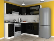ROZMERY: skrinky dolná šírka: 190 cm x 170 cm skrinky horná šírka: 190 cm x 170 cm výška skriniek dolných: 86 cm (2,8 cm pracovná doska/ 10 cm podstavec) výška skriniek horných: 58 cm hĺbka skriniek horných: 30 cm hĺbka skriniek dolných: 45 cm hĺbka pracovnej dosky: 60 cm.
