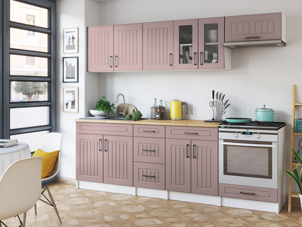 ROZMERY: skrinky dolná šírka: 240 cm skrinky horná šírka: 240 cm výška skriniek dolných: 86 cm (2,8 cm pracovná doska/ 10 cm podstavec) výška skriniek horných: 58 cm hĺbka skriniek horných: 30 cm hĺbka skriniek dolných: 45 cm hĺbka pracovnej dosky: 60 cm.