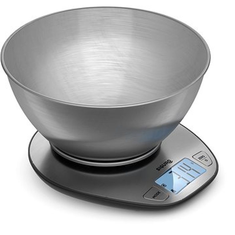 Kuchynská váha – do 5kg, presnosť 1g, jednotky kg, g, lb, ml, oz; s odnímateľnou antikorovou misou (objem 1.8l), automatické vypnutie, funkcia TARE (na odčítanie hmotnosti nádoby na navažovanie), indikátor preťaženia a slabej batérie, antikorový materiál, LCD displej 28×27mm, rozmery 13×21.5×21.5cm, napájanie 2× AAA batérie (v balení), 3 roky záruka Kuchynská váha Siguro SC510SSKvalitná kuchynská váha je pri varení a obzvlášť pečení nutnosťou. Preto by vo vašej kuchyni nemala chýbať. Kuchynská váha s antikorovou miskou Siguro SC510SS umožňuje vážiť ingrediencie s hmotnosťou až 5 kg s presnosťou 1 g. Váha zaujme nielen svojimi funkciami, ale aj nádherným antikorovým dizajnom. Navyše sa ľahko udržuje – vážiacu plochu stačí utrieť vlhkou handričkou.Odnímateľná misaSúčasťou váhy je aj odnímateľná antikorová misa s objemom 1,8 l. Vážiaca plocha má vyvýšený okraj, takže sa miska nešmýka. S váhou Siguro SC510SS môžete vážiť nielen suroviny, ale aj merať objem.