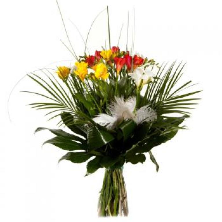 Kytica frézií s pierkami.Charakteristika:.Štíhle frézie dokonale upútajú svojou omamnou vôňou. Rozmarné pierka v kytici sú originálnou dekoráciou. Ľahkosť kytice z nej robí vhodný dar pre mamičku i babičku.Starostlivosť:.Kyticu po obdržaní tak ako všetky kvety treba pred vložením do vázy zastrihnúť, aby vydržala čo najdlhšie a nasypať môžete ihneď Flower food, ktorý je pripojený ku každej kytici pri objednávke zdarma.NOVINKA! Zdarma Flower Food - výživa pre kvety.Zloženie:.15 x frézia mix, 3x robeliny, 5x aspidistra, 2x arália/väčší list, tráva, zdobenie-3 pierka na drôtiku, farba podľa ponuky.Priemerná výška kytice: 40 - 50 cm.