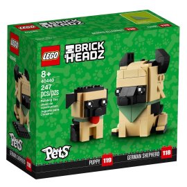 Deti, ktoré milujú domáce zvieratá, si zamilujú túto stavebnicu psa a šteňaťa zo série BrickHeadz™ na postavenie a vystavenie. Nemecký ovčiak nosí šatku a má pohyblivý chvost. Roztomilé šteňa zasa vyplazuje červený jazyk. Psy sedia spolu na pevnej podložke v ozdobenom koši, vďaka čomu je táto stavebnica zvieratiek skvelý darček pre všetky deti, zberateľov modelov BrickHeadz a milovníkov domácich zvierat.