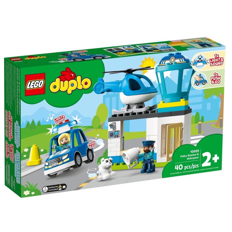 LEGO® DUPLO® (LEGO 10959) Policajná stanica a vrtuľník je policajný set pre najmenších plný postáv a vozidiel, ktoré deťom od 2 rokov ponúkajú hravú inšpiráciu. Hra plná rozvoja na policajnej stanici. V policajnej stanici to žije zábavou! Nájdete v nej policajné auto s technológiou Push&Go, blikajúcimi svetlami a sirénou (batérie sú súčasťou balenia), rozkošného psíka, ktorého si môžete vycvičiť, a rozhľadňu, odkiaľ môžu policajní strážnici sledovať policajný vrtuľník s otáčavými čepeľami rotora. Počas stavania a hier si budú deti cibriť jemnú motoriku, emocionálne vnímanie a mnoho iných zručností. A keďže majú akciu vždy vo svojich rukách, bez starostí sa môžu naučiť všetko o práci policajtov. Škola hrou pre najmenších. Hračky LEGO DUPLO deťom vkladajú do rúk zábavu bez hraníc, možnosti sebavyjadrenia a hravého skúmania. Rodičia tak môžu so svojimi najmenšími prežívať vzácne míľniky vo vývoji.