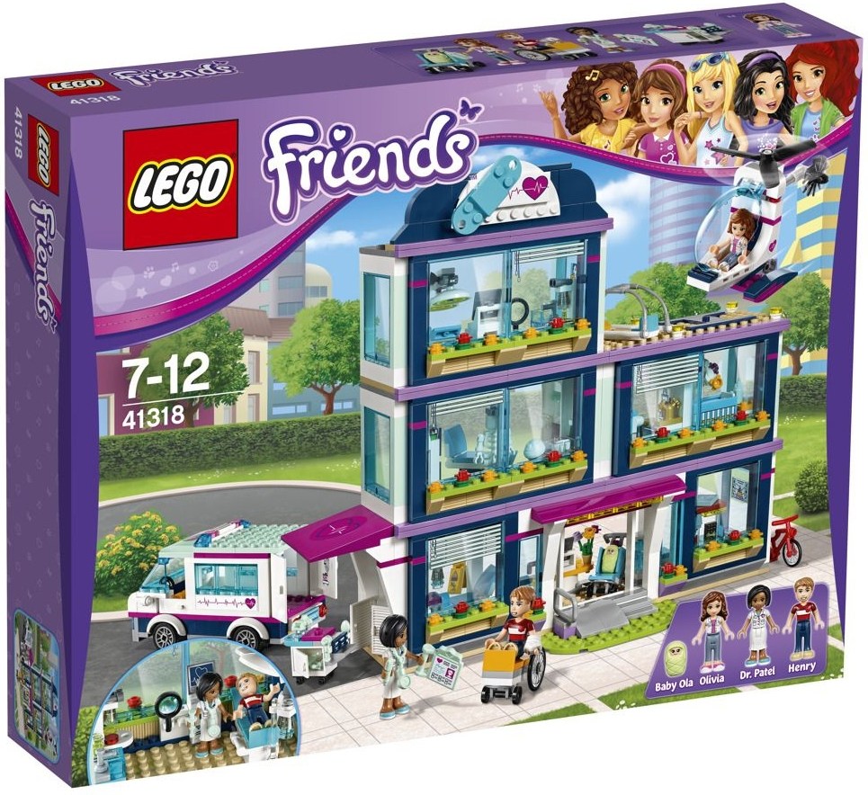 Staraj sa o pacientov v nemocnici v Heartlake so sanitkou, helikoptérou,čakárňou, ordináciou, röntgenovým kútom a jasličkami. Súčasťou súnaviac tri minifigúrky – bábiky. Nemocnica v Heartlake od LEGO® Friendsmá tri podlažia plné izieb a lekárskeho vybavenia, využívaného pristarostlivosti o pacientov. Sú tu nemocničné jasličky s postieľkou a váhami, röntgenový kút soskenerom a svetelným boxom a ordinácie s posteľou a mikroskopom na skúmanievzoriek. Čakáreň na prízemí má recepciu a predajný automat a tiežnúdzový vstup pre pacientov, dovezených sanitkou alebo helikoptérou.Súčasťou sú tri minifigúrky – bábiky, navyše figúrka bábätka. Rozmery balenia a špecifikácie: Súčasťou sú tri minifigúrky – bábiky: Olivie v uniforme zdravotnésestry, Henry a doktorka Patelová, navyše figúrka bábätka Oly.Obsahuje trojposchodovú upraviteľnú nemocnicu, helikoptéru s nosidlami,sanitku s nosidlami na kolieskach, invalidný vozík, kočík, lekársky vozíka koleso.Nemocnica má čakáreň s posuvnými dverami, recepciou, posedením,predajným automatom, osviežovačom a akváriom, núdzový vchods krídlovými dverami; röntgenový kút s otočnou posteľou, skenerom,svetelným boxom a kostrou, jasličky s hojdacou postieľkou, váhami asociálnym zariadením s prebaľovacím stolom, ordináciu s lôžkom,monitorom a mikroskopom a pristávaciu plochu pre helikoptéru.Medzi doplnkami nájdeš odliatok ruky, röntgenové dlaždice,zväčšovacie sklo, fľaštičky na vzorky, nožnice, upozornenie na mokrúpodlahu a fľašu na kŕmenie.Začni akciu akonáhle príde sanitka a ponáhľaj sa s pacientomnúdzovým vchodom.Urob Henrymu röntgen ruky a daj mu ruku do sádry, aby sa čoskorozahojila.Uži si kŕmenie a váženie novorodeného bábätka v jasličkách.Pomôž doktorke liečiť pacientov počas štandardných obchôdzoks lekárskym vozíkom.Vymýšľaj ďalšie a ďalšie príbehy o pacientoch a ichuzdravovaní.Prestavuj túto upraviteľnou sadu mnohými rôznymi spôsobmi.Nemocnica meria cez 27 cm na výšku, 30 cm na šírku a 7 cmdo hĺbky.Sanitka meria cez 6 cm na výšku, 12 cm na dĺžku a 4 cmna šírku.Helikoptéra aj s rotormi meria cez 7 cm na výšku, 11 cm na dĺžku a4 cm na šírku.