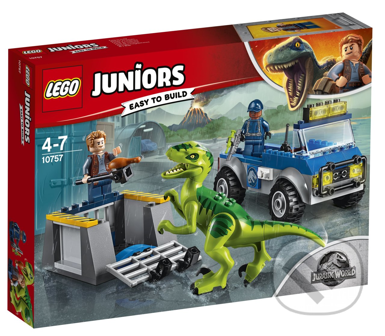 Uveďte svoje dieťa do vzrušujúceho sveta objavovania v dobrodružstve LEGO® Juniors Jurský svet s touto vzrušujúcou stavebnicou Záchrana raptora s nákladiakom, ktorá obsahuje karosériu pre rýchly štart a odnímateľnú klietku s otváracou bránou plus polohovateľného a zostaviteľného raptora s otváracou tlamou. Táto zábavná hračka tiež obsahuje jednoduchý návod na stavanie a hru na podporu budovania dôvery u detí vo veku 4 až 5 rokov. Stavebnica obsahuje minifigúrku Owena a stopára a figúrku raptora navyše.- Stavebnica obsahuje 2 minifigúrky: Owen a stopár.- Obsahuje terénny nákladiak s karosériou pre rýchly štart a nákladný priestor vzadu pre odnímateľnú klietku s otváracou bránou a priestorom pre zostaviteľného raptora.- Prilákaj raptora do klietky na kuracie stehienko na palici.- Zatvor bránu a uväzni raptora vnútri.- Zaisti klietku vzadu na nákladiaku a unikni pred vybuchujúcou sopkou.- Medzi doplnkami nájdeš uspávaciu pištoľ, vysielačku, palicu a kuracie stehienko.- Táto zábavná hračka je vhodná pre deti vo veku od 4 rokov.- Obsahuje ľahko zostaviteľné modely so základňou pre rýchly štart plus jednoduchú príručku na pomoc deťom pri stavaní a hre.- Stavebnice LEGO® Juniors sú plne kompatibilné so všetkými ostatnými stavebnicami LEGO.- Nákladiak meria viac než 7 cm na výšku, 14 cm na dĺžku a 7 cm na šírku.- Klietka meria viac než 4 cm na výšku, 7 cm na šírku a 6 cm do hĺbky.- Raptor meria viac než 7 cm na výšku, 12 cm na dĺžku a 3 cm na šírku.Počet kusov - 85Dolná veková hranica Odporúčanie - 4 RokyHorná veková hranica Odporúčanie - 7 RokyPožiadavky na batériu: Nie Raptor a záchranárske vozidlo.