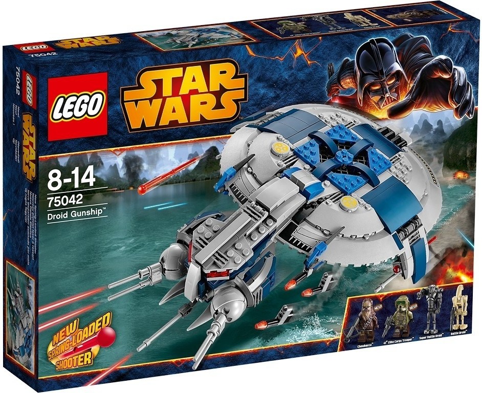 Lego Star Wars 75042 Droid Gunship (Bombardér droidov), výrobca LEGO. Vypustite bomby, namierte laserová delá umiestnená vpredu a odpáľte nové pružinové strely umiestnené na bokoch. Super odolný bombardér droidov vnesie do bitky o Kashyyyk poriadnu palebnú silu. Pomocou tohto vyzbrojeného stroja ľahko odrazíte sily Republiky. Ak sa bitka poriadne rozhorí, odpojte prednú časť a utečte. Sada obsahuje minifigúrky Chewbacca a troopera 41. elitnej jednotky plus figúrky super bojového droida a bojového droida s rôznymi zbraňami.Počet dielikov 439, počet figúrok 4Pre deti od 8 rokov.
