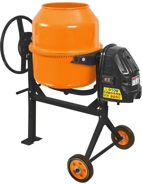 Stavebná miešačka s elektrickým motorom. Príkon 500 W. Objem 120 l. Hmotnosť 43,5 kg.