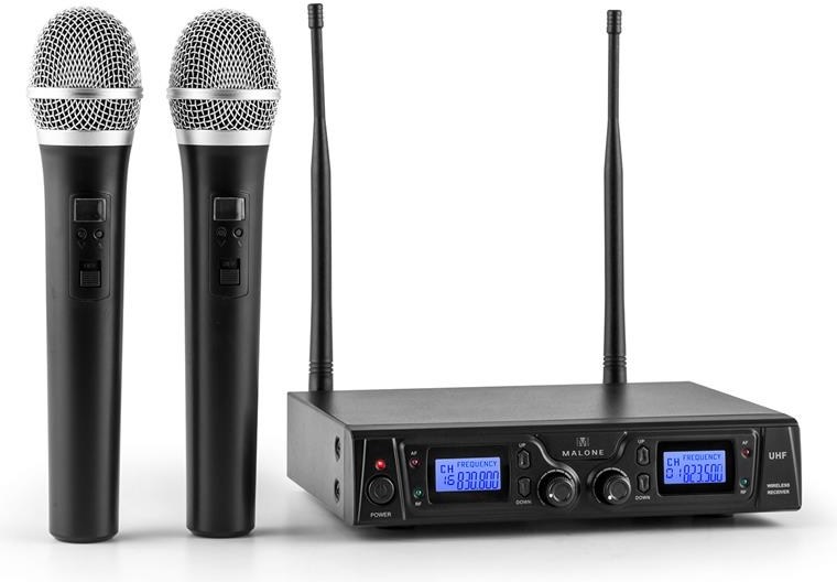 Bezdrôtový mikrofónový set obsahujúci dva príručné dynamické mikrofóny so vstavaným vysielačom a prijímač. Dvojica dynamických mikrofónov má vysielač vstavaný priamo v konštrukcii vďaka čomu nie je potrebné používať žiadny bodypack. Mikrofóny sú optimalizované pre hovorené slovo a spev a sú vybavené vstavaným pop filtrom. Prijímač je vybavený niekoľkými frekvenčnými pásmami pre bezproblémové fungovanie, separátny Volume pre každý bezdrôtový signál, duálny displej, duálny XLR symetrický výstup pre pripojenie do PA alebo do mixu a 6.3 mm Jack nesymetrický konektor ako alternatívny výstupný konektor. Set pracuje v pásme 832-864 MHz a je obzvlášť vhodný pre konferencie, prejavy, diskusie alebo rozhovory. Hmotnosť mikrofónu: 180 g, dĺžka mikrofónu 23 cm, hmotnosť prijímača: 705g, rozmery prijímača: 21.5 x 5 x 18 cm. Farebné prevedenie: Black.