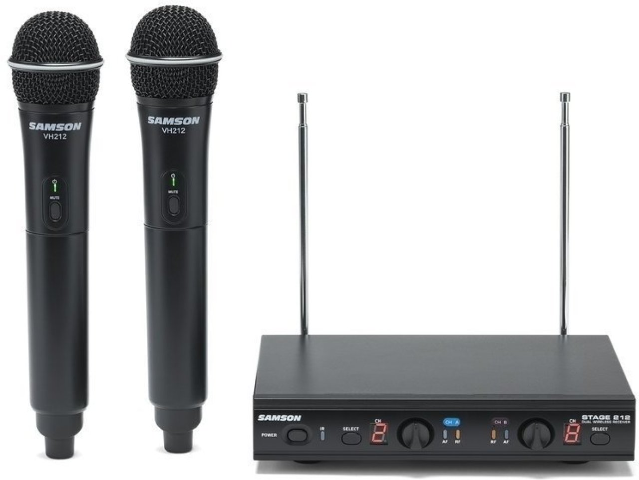 Samson Serie Stage 212 je dvojkanálový bezdrôtový set s dvojicou dynamických mikrofónov do ruky. Tento set pracuje v pásme 173MHz-198MHz a vysielaciu frekvenciu možno nastaviť pomocou IR lúča. Mikrofóny sú osadené kvalitné mikrofónny vložkou z mikrofónu Q6, ktorá poskytuje veľmi čistý a verný prenos ľudského hlasu.Samson Stage 212 ponúka 12 laditeľných frekvencií v pásme 173MHz-198MHz. Ladenie frekvencií medzi vysielačom a prijímačom prebieha pomocou IR lúča. Systém Stage 212 ponúka prenos signálu až na vzdialenosť 60m. Napájanie vysielača je zabezpečené dvojicou AA batérií, ktoré poskytnú až 10 hodín prevádzky. Prijímač SR212 je osadený v elegantnom kovovom šasi, ktoré poskytuje dokonalú ochranu. Každý kanál je opatrený vlastným linkovým výstupom s konektorom Jack a signál z oboch kanálov je možné odoslať cez jeden symetrický výstup s konektorom XLR. Na prednom paneli sa nachádzajú nezávislé ovládače hlasitosti pre každý kanál.Bezdrátový set Samson Stage 212 poskytuje dokonalý bezdrôtový prenos v bezpečnom VHF pásme, ktoré nie je dotknuté prevádzkou mobilných operátorov a televíznym signálom.