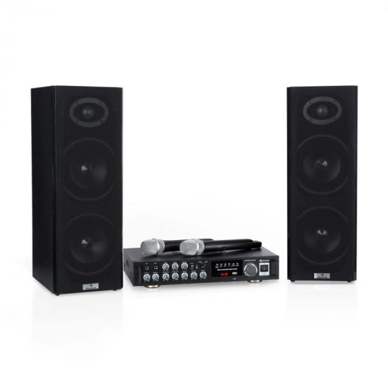 Pridajte zvuk! Karaoke sada auna Karaoke Star 4 prináša na Vaše posedenie hudbu a spev vďaka svojmu silnému výkonu, mnohým možnostiam pripojenia a dvom bezdrôtovým ručným mikrofónom. Zosilňovač a dva reproduktory s drevenou skriňou a s výkonom 2 x 80 W max. poskytujú silný zvukový obraz so stabilnou kvalitou zvuku. Vďaka funkcii bluetooth sa dá prenášať mnoho audio súborov spoľahlivo cez smartfón, tablet alebo laptop. Ďalšie pripojenia taktiež rozširujú pôžitok z hudby: USB port umožňuje prehrávanie hudby vo formáte MP3, zatiaľ čo linkový vstup preberá pripojenie k DVD prehrávaču a USB výstup zabezpečuje pripojenie k ďalším reproduktorom. Dva káblové mikrofóny môžu byť pripojené k dvom mikrofónovým vstupom - dva bezdrôtové ručné mikrofóny sú hneď súčasťou balenia. Prehľadné otočné regulátory umožňujú jednoduché ovládanie nastavenia basov, výšok, echa a vyváženia. Pomocou LED displeja s modrým podsvietením je možné pohodlne sledovať všetky procesy. Ideálna sada pre všetkých milovníkov spevu! Motivuje s karaoke sadou auna Karaoke Star 4 svojich priateľov k hudobným výkonom.