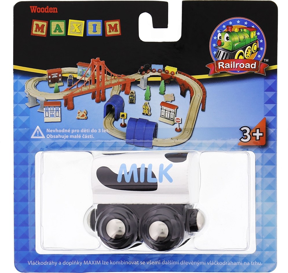 Vagón drevené vláčikodráhy.Vek: 3+.Vagón, ktorý rozšíri sortiment dodávaného tovaru. V horách, kde sa pasú tie najzdravšie kravy, miestni farmári predávajú kvalitné mlieko, ktoré putuje do mesta. Stačí naplniť vagón mliekom a vydať sa do mesta, kde už na neho s netrpezlivosťou čakajú ľudia, deti a mliekarne, ktoré z neho vyrábajú najlepšie jogurty na svete. Tiež môžete dať komukoľvek po ceste napiť mlieka z hôr. Vláčikodráhy a doplnky Maxim možno kombinovať so všetkými ostatnými drevenými železničnými dráhami na trhu (Brio, Bino, HEROSE, Thomas a i.). Vhodné pre deti od 3 rokov, obsahuje malé časti.Spoločnosť MAXIM Enterprise, Inc. je medzinárodný výrobca špecializujúca sa na výrobu drevených hračiek. Hračky tejto spoločnosti sú vyrobené z veľmi tvrdého dreva a boli navrhnuté špeciálne pre malé deti. Vyznačujú sa vysokou kvalitou a bezpečnosťou. Už dlhšie ako 25 rokov pracuje spoločnosť Maxim na tom, aby mohla ponúknuť hračky vysokej kvality, cenovo dostupné pre každého.Manuálnu zručnosť, sebaistota, kreativita, koordinácia očí a rúk, rozpoznávanie farieb a čísel sú príkladom len niekoľkými z celej rady zručností, ktoré pomáhajú rozvíjať výrobky spoločnosti Maxim. Vláčkové dráhy od spoločnosti Maxim majú najvyššiu kvalitu a sú k dispozícii v najrôznejších cenových reláciách. Spoločnosť Maxim je jednotkou v predaji drevených hračiek na trhu v USA a Kanade. Vláčikodráhy od spoločnosti Maxim sú plne kompatibilné s výrobkami Thomas, Brio, Bino a s ostatnými kvalitnými železničnými systémami vyrobenými z dreva.