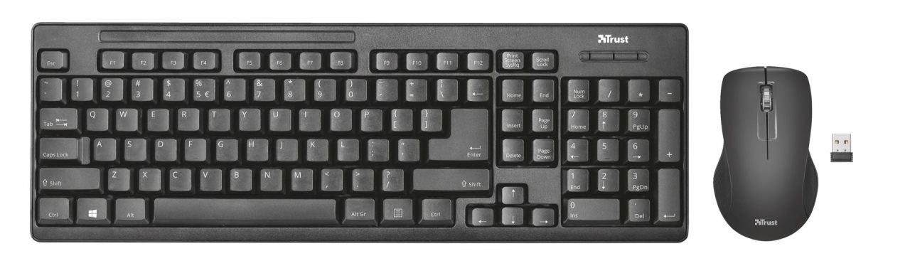 Set klávesnice a myši, česká a slovenská kancelárska klávesnica, bezdrôtová, WiFi konektor, vysokoprofilové klávesy, optická myš, 1600 DPI, 3 tlačidlá, symetrická, Miniatúrny senzor.Súprava klávesnice a myši Trust Ziva ponúka bezdrôtovú klávesnicu s českými znakmi, ktorá je odolná proti poliatiu, a bezdrôtovú optickú myš (1600 DPI) pre pravákov aj ľavákov. Dosah oboch zariadení je až 10 m. Na pripojenie slúži jeden micro-USB prijímač, ktorý je spoločný pre klávesnicu aj myš. Kompletná súprava vyžaduje 3× AAA batérie. Klávesnica aj myš sú dodávané v čiernej farbe.Kľúčové vlastnosti súpravy Trust Ziva Wireless Keyboard and MouseSada obsahujúca bezdrôtovú klávesnicu a myš značky TrustDosah oboch zariadení je 10 mKlávesnica je vybavená českými znakmiMyš je vhodná pre pravákov aj ľavákov1 × micro-USB prijímač pre obe zariadeniaDovedna vyžaduje 3× AAA batérie.