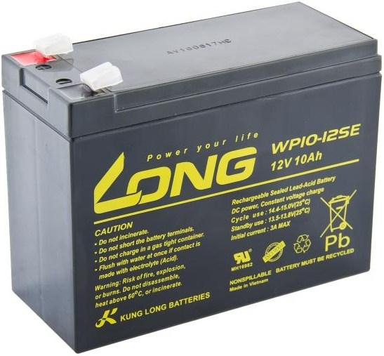 Konektory: F2Rozměry (DŠV): 151 x 65 x 112mm.Parametry:.Konektory: F2.Napětí: 12 V.Kapacita: 10 Ah.Rozměry (d x š x v): 151 x 65 x 112mm.Hmotnost: 3,29kg.Elektrolyt: AGM.Typ akumulátoru: DeepCycle.Označení akumulátoru a jeho ekvivalentů: WP10-12SE, REC10-12.AGM - (Absorbed Glass Mat) je olověný VRLA akumulátor, ve kterém je elektrolyt nasáknut do netkané textilie ze skelného vlákna.DeepCycle - určena pro cyklické vybíjení.Olověný akumulátor je díky svému určení pro cyklické vybíjení vhodný zejména pro použití v elektropohonech, elektrických vozítkách včetně golfových, pro napájení rybářských člunů, solární aplikace, pro hlubší vybíjení a větší proudové zatížení.Při použití nevhodného nabíječe dojde k nevratnému poškození akumulátoru!Přečtěte si také všeobecné informace o olověných akumulátorech.