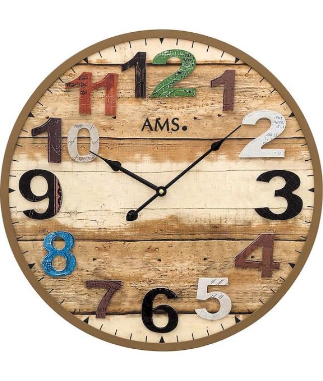 Nástenné hodiny ukazovateľ času analógový, napájanie na baterky, umiestnenie: obývacia izba Aby ste vedeli, aký je skutočne presný čas, nástenné hodiny AMS 9539 vám prídu vhod. Hodiny kruhového tvaru netradičného vzhľadu sú vyrobené z kovu hnedej farby a doplnené drevenou doskou, na ktorej sú prilepené farebné čísla. Hodiny pôsobia veselým dojmomzvlášť vďaka farebným políčkam s číslicami, takže sa hodia do miestností, kde potrebujete oživiť atmosféru. Vďaka veľkým čísliciam je čas viditeľný aj z väčšej vzdialenosti.Kľúčové vlastnosti nástenných hodín AMS 9539Veľké nástenné dizajnové hodinyHodiny AMS majú tlačený číselníkDrevená základňa je vyrobená z hnedého Antik drevaVeľké dobre čitateľné arabské číslice.
