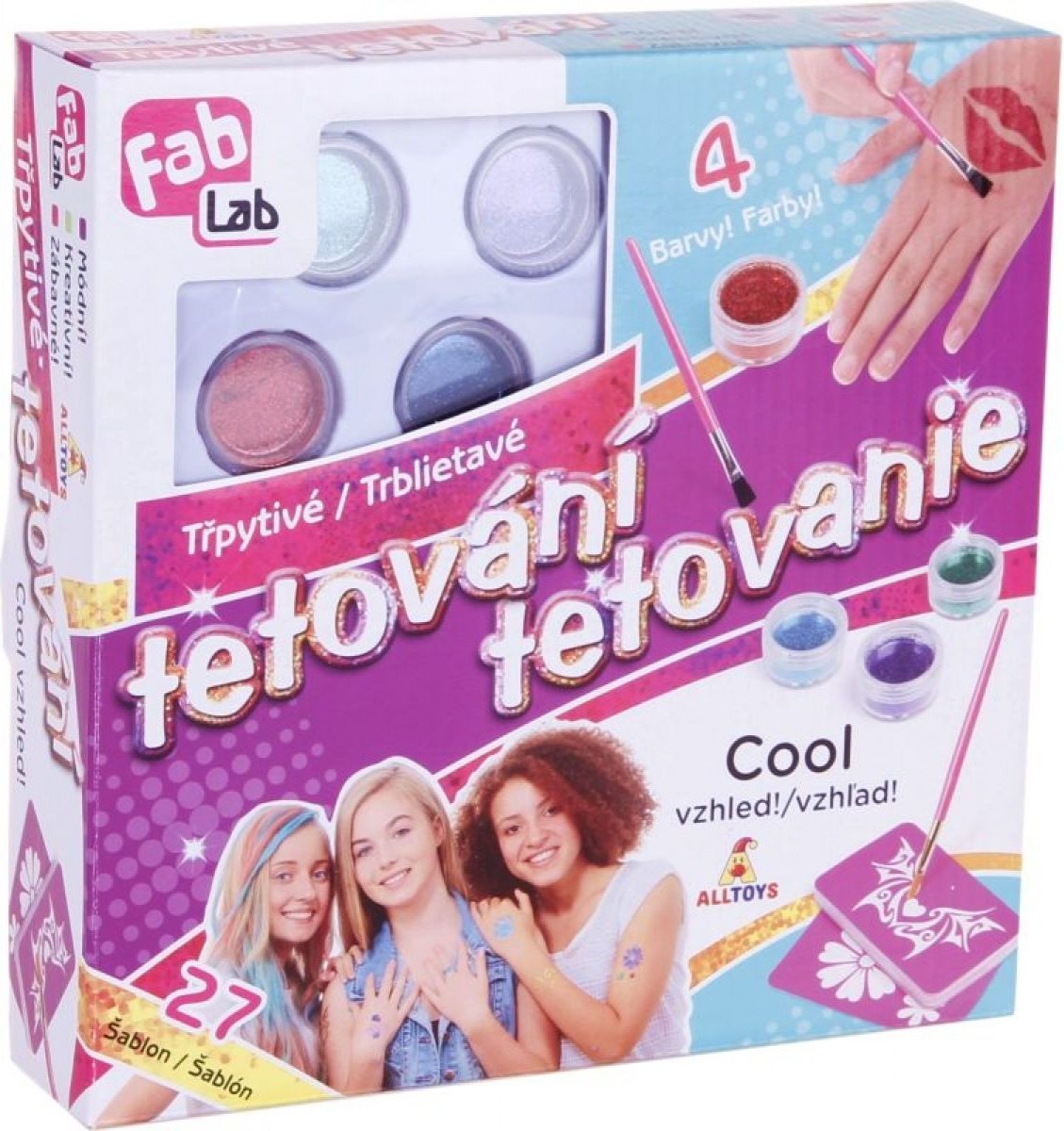 Skrášľovacia súprava – vhodná od 3 rokov.Každé dievča chce byť in a moderné, a chce zažiť veľa zábavy. Napríklad spolu s kamarátkami si otvoriť vlastný malý tetovací salón. S touto skrášľovacou kreatívnou súpravou trblietavých farieb a originálnych šablón nič nie je nemožné! Súprava Fab-Lab Trblietavé tetovanie obsahuje len kvalitné materiály – 27 šablón, 4 trblietavé farby, lepidlo na kožu, mäkký štetec a ešte stredne tvrdý štetec na kontúry. Súčasťou balenia je aj šikovný návod, v ktorom dievčatká okrem spôsobu použitia nájdu aj inšpiráciu pre svoje výtvory. Kľúčové vlastnosti skrášľovacej súpravy Fab-Lab Trblietavé tetovanieSúprava je vhodná pre dievčatá už od 3 rokovFab-Lab Trblietavé tetovanie obsahuje až 27 šablón na tetovanie, 4 nádobky s trblietkami, lepidlo, a 2 štetceSúčasťou balenia je aj praktický návod s tipmi na jednotlivé tetovania.