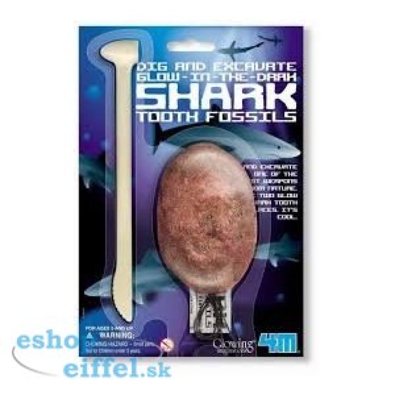 Sadrové vajíčko v sebe ukrýva 2 žraločie zuby! Vykopte si ich pomocou špeciálneho nástroja a urobte si z nich prívesok na krk! Najprv jemne odstráňte šupku vajíčka plochou stranou vykopávajuceho nástroja. Pri vykopávaní postupujte opatrne, aby ste žraločie zuby nepoškodili. Po vykopaní ich utrite kusom látky a priviažte na priložený povrázok tak, ako je to zobrazené na zadnej strane balenia. Vystavte zuby svetelnému zdroju, zuby potom budú svietiť v tme.