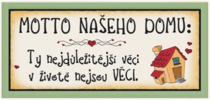 Drevená ceduľa s nápisom: Motto nášho domu: Tie najdôležitejšie veci v živote nie sú veci.Veľkosť: 30 x 13,5 cm.Pojmy spojené s týmto produktom:Drevená, ceduľa, darček, dekorácia, nápis, motto, dom.