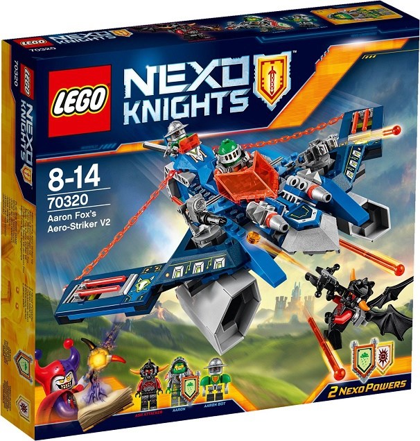 LEGO Nexo Knights 70320 Aaronov Aero Striker V2, výrobca LEGO. Ponor sa hlbšie do futuristického sveta LEGO NEXO KNIGHTS s úžasným Aero-Strikerom V2!Premeň sa na Aarona Foxa pomocou kuše-lietadla 2 v 1!Prehrávaj si bitky proti lávovým príšerám, stlač spúšť dvojitých pružinových vystreľovačov a vystreľuj z nich. Potom vystreľ Aarona proti okrídlenému útočníkovi Ashovi a strieľaj z kuše, alebo vyleť s rytierom v jeho lietadle v tvare šípu a nechaj Aaronovho robota prevziať kontrolu nad strojom!Obsahuje snímateľné štíty s 2 NEXO Silami: ľadovým dažďom a Cieleným výbuchom.Obsahuje 3 minifigúrky: Aarona Foxa, Aaronovho robota a útočníka Ashe.Naskenuj štíty a získaj NEXO Silu na hru online!Sleduj všetky svoje obľúbené postavy z NEXO KNIGHTS na kanáli Cartoon Network.Počet dielikov 301, počet figúrok 3.Vhodné pre deti od 8 rokov.