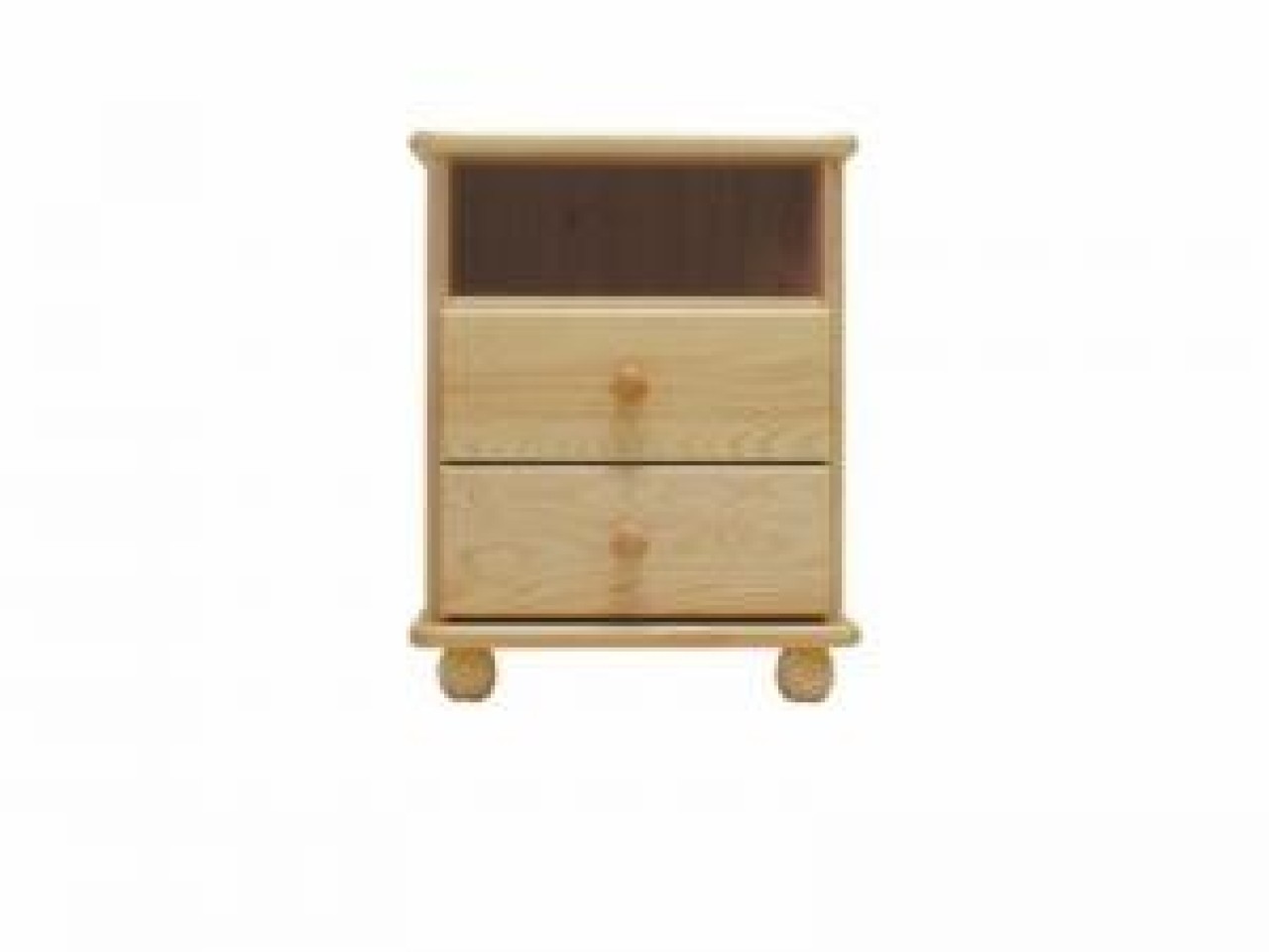 Elegantný, praktický nočný stolík s dvomi šuflíkmi a otvoreným odkladacím priestorom nad nimi. Dostupný v rôznych moreniach – dub, jelša, čerešňa či orech za príplatok 10% z ceny alebo v bielom prevedení za príplatok 30% z ceny. Dodávame v zmontovanom stave. Farba produktu na obrázku: prírodná borovica ošetrená povrchovým ekologickým lakom.
