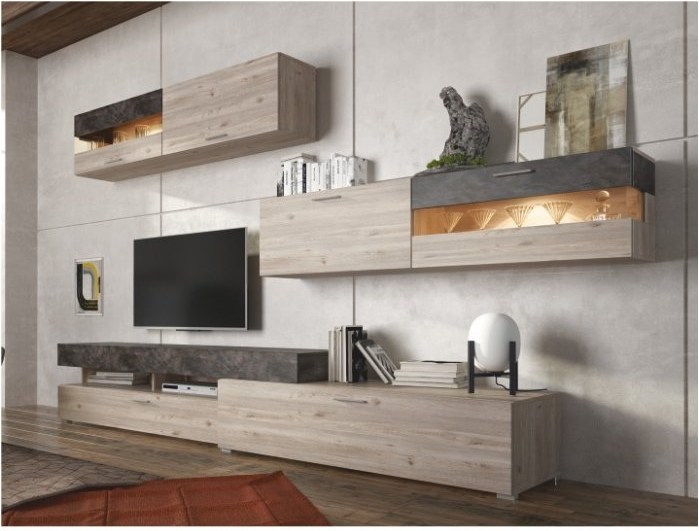 Elegantná obývacia stena IOVA je veľmi moderná a štýlová stena, ktorá nikdy nevychádza z módy. Vďaka svojej jedinečnej farebnej kombinácii a materiálu, z ktorého je vyrobená, pôsobí moderne a zároveň zútulní Vašu obľúbenú miestnosť. Charakteristickým rysom obývacej steny sú elegantné úchytky, ktoré dodajú miestnosti elegantný vzhľad. Obývacia stena IOVA sa výborne hodí do moderných miestností. Obývacia stena IOVA má v cene LED osvetlenie v nadčasovom prevedení.Materiál: DTD laminovaná .Rozmery: (ŠxVxH) 276 x 193 x 48 cm.Farebné prevedenie: dub nelson/ betón.Upozornenie: Váš monitor nemusí zobrazovať farby, také ako sú v skutočnosti! Na sklá sa nevzťahuje reklamácia, je potrebné si ich skontrolovať pri preberaní tovaru!