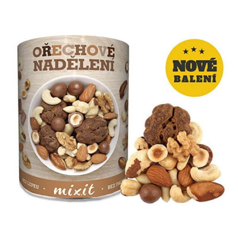 Orechy - natural, viacdruhové para, kešu, arašidy, lieskové orechy, mandle a vlašské, hmotnosť: 450 g Zmena farebného štýlu šablóny pre potraviny Orechové nadelenie Mixit450 gTubus obsahuje kombináciu vlašských orechov v horkej čokoláde a škorici, lieskové oriešky v mliečnej čokoláde a ďalšie jadrá najrôznejších ...viac
