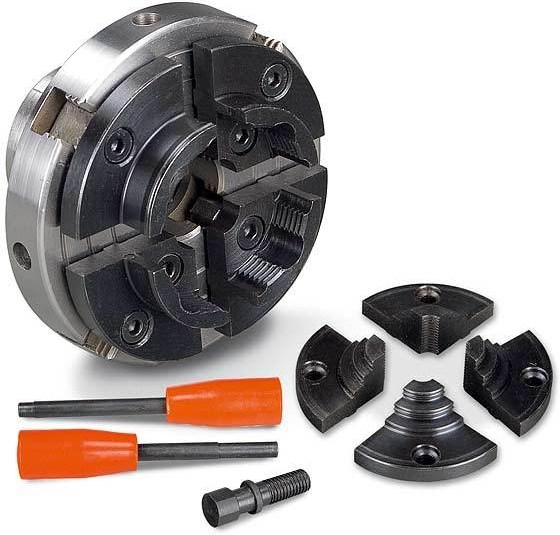 Soustružení, soustruhy na dřevo - sklíčidlo pr. 100 mm se šrouby a výměnnými čelistmi Čtyřčelisťové sklíčidlo (soustředné) pr. 100 mm Určeno pro soustruh na dřevo DB 900, DB 1100 a DB 1200 Připojovací rozměr (Závit vřetene): M 33 x 3,5 Sada 2 - se šrouby a výměnnými čelistmi.